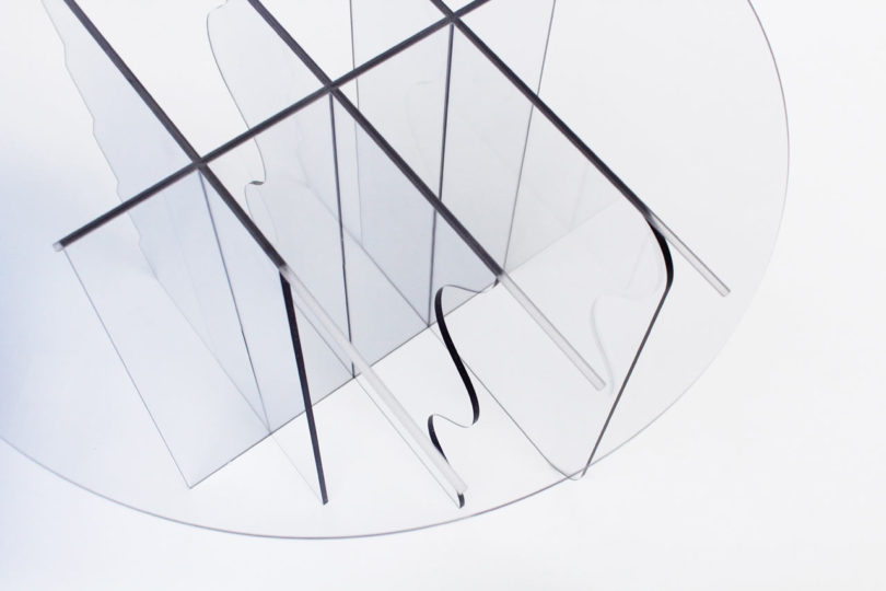 Tint, zoals ze de collectie noemde, dat zijn ze ook daadwerkelijk kunststof componenten, welke zonder het gebruik van gereedschap in elkaar zetten een theetafel. Plastic onderdelen zijn overblijfselen van het plastic verfproces. Elk stuk Jurkilesova dan vormt hij er een onderdeel van met een inkeping waar het volgende onderdeel in gaat, enzovoort, totdat de salontafel staat. Maar het kan best leuk zijn om in elkaar te zetten, omdat er niet slechts één versie is, maar meerdere, zodat je je fantasie de vrije loop kunt laten.