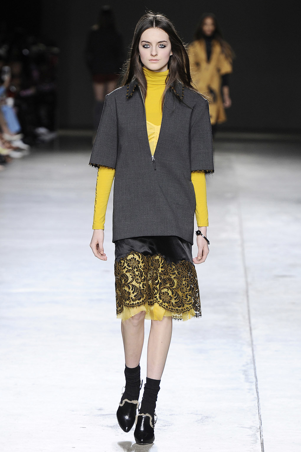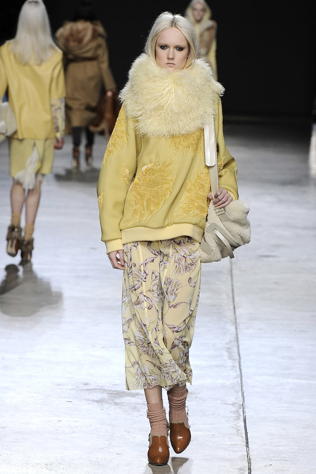 Ze flirten met verfijnde vrouwelijke elegantie in de vorm van lange, soepel vallende jurken met kanten details, sensuele tops, grote schapenvachtjassen en zachte oversized gebreide stoffen die het lichaam omhullen. Aan de andere kant worden ze vergezeld door edgy, scherpe items die hun tegenpool zijn. Donsjacks in metallic tinten, scherp getailleerde jassen die soberheid uitstralen, elementen uit de herengarderobe, leren jassen en hoge laarzen die scherpte toevoegen. Topshop Unieke Collectie, die laat zien dat jongensachtige meisjes ook sensueel zijn, is gehuld in tinten grijs, blauw en groen, met zeldzame kleuraccenten.