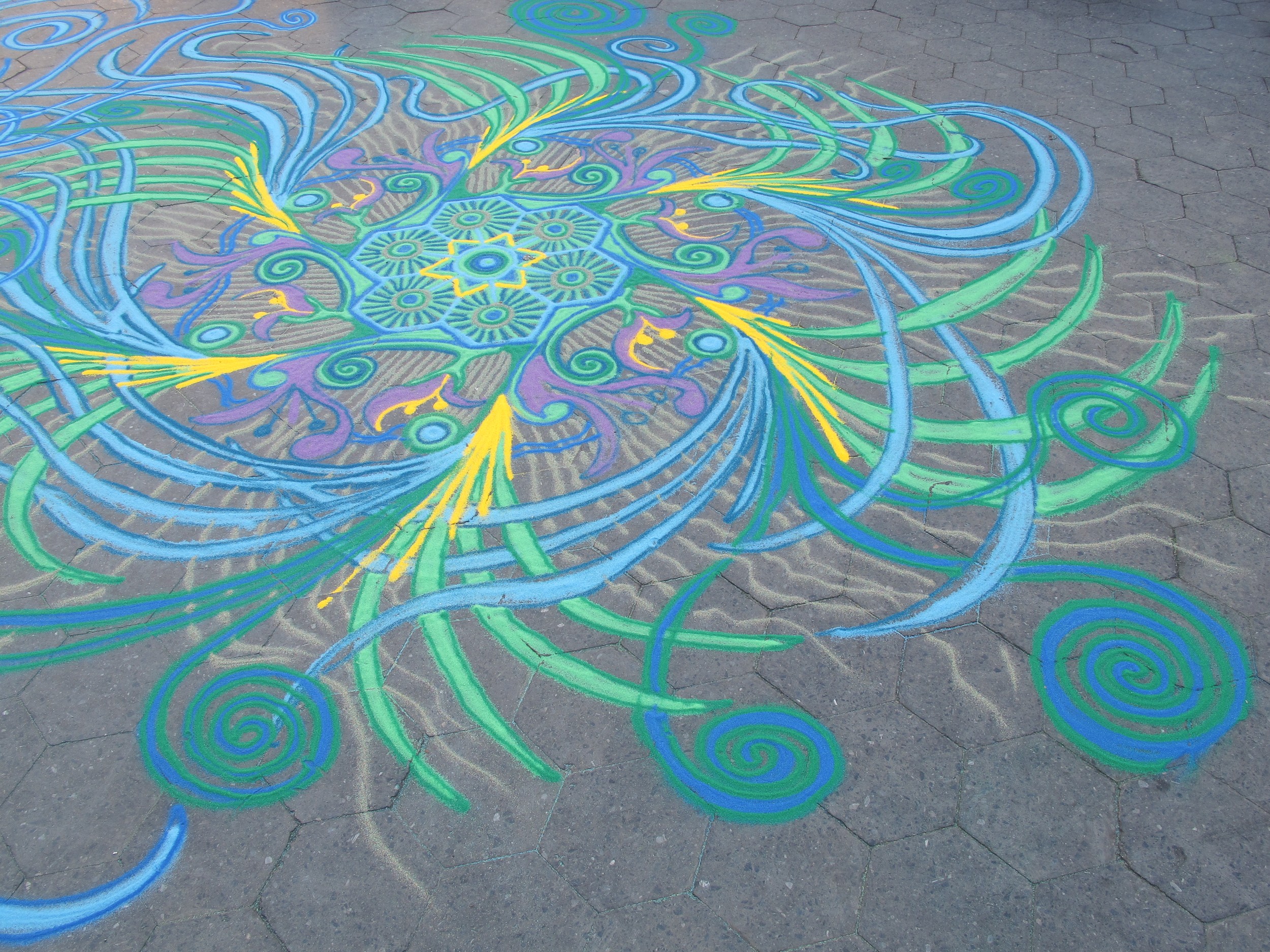 Oborožen z vrečkami barvnega peska se Joe Mangrum zadnjih nekaj let sprehaja po mestnih ulicah in z njim ustvarja neverjetne vzorce. Vsaka njegova umetnina je popolnoma spontana in se zgodi v trenutku navdiha. Za njo potrebuje med šest in osem ur, sicer pa umetnik ocenjuje, da jih je do sedaj ustvaril že približno 550.