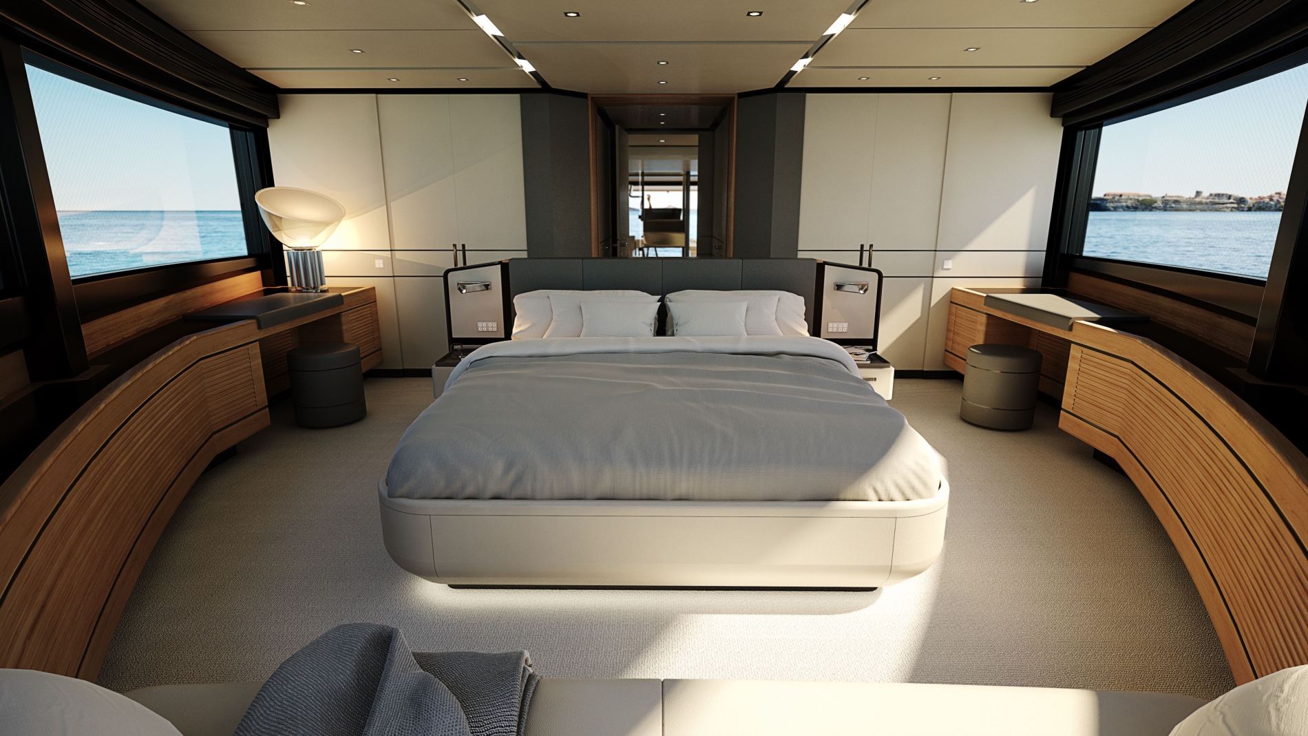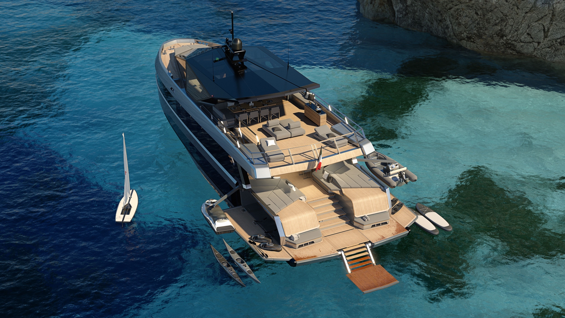 De meest luxe ruimte zit verstopt in de boeg en is natuurlijk de eigenaarssuite. Alleen deze is aan alle kanten omgeven door ramen en biedt een panoramisch uitzicht op de uitgestrekte zee. Op het achterschip zijn vouwdekdelen aangebracht die extra ruimte bieden om te genieten van de zon en te recreëren. In de boeg van het jacht bevinden zich twee grote garages, die voldoende ruimte bieden aan een stel water-ʺspelersʺ. Vier krachtige Volvo-motoren zorgen voor de aandrijving 588 of 735 kW, die het jacht helemaal naar toe stuwen 23 knopen. Brandstoftanks, in gangbare maat 12.000 liter en een waterreservoir groot 2.200 liter, toestaan tot 390 zeemijl bereik en geniet van de luxe van een prestigieus jacht.