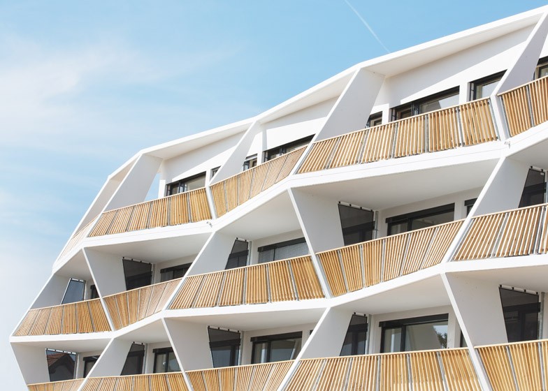 De gevel van een nieuw appartementencomplex in Graz, Oostenrijk, wordt verlevendigd door interessante zigzagbalkons.