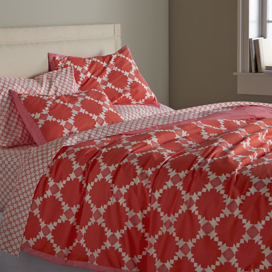 Sončni koralni geometrijski vzorci na posteljnini se bohotijo in kraljujejo na veliki postelji. Močni, nesramežljivi, glasni, udarni vzorci londonske oblikovalke Genevieve Bennett so prava poživitev spalnice. Močni pastelni odtenki v koralno beli kombinaciji se čudovito dopolnjujejo z belim pohištvom ali belimi stenami v sobi.