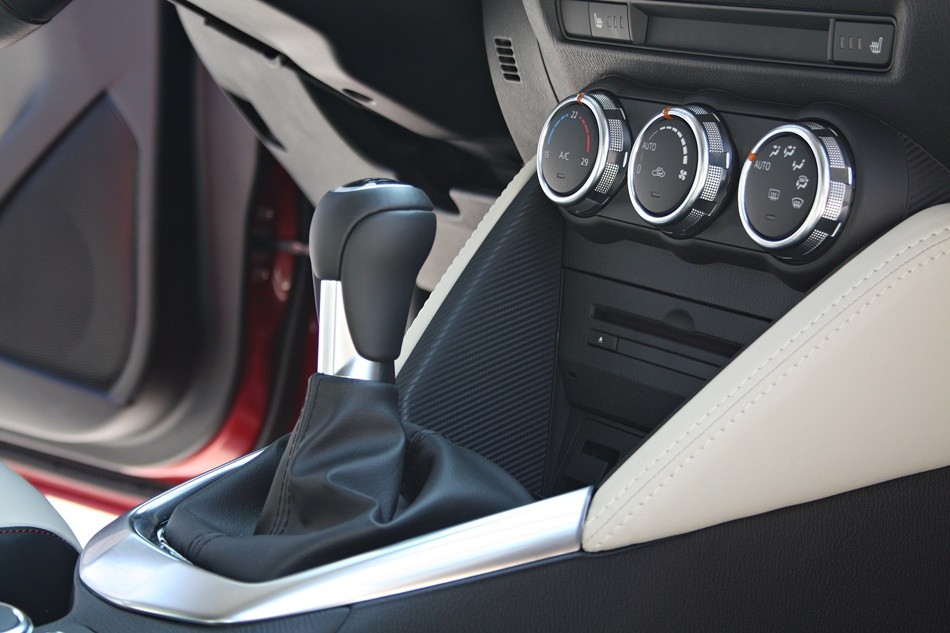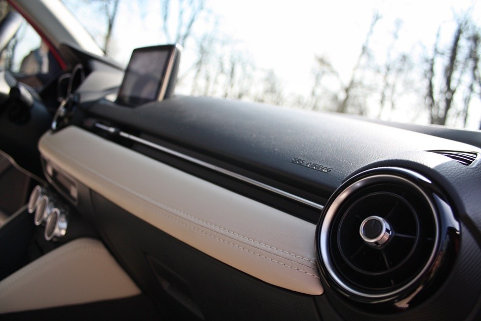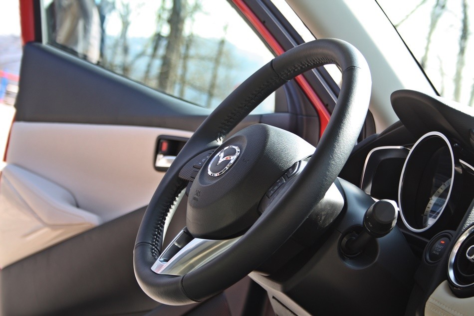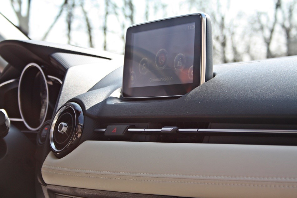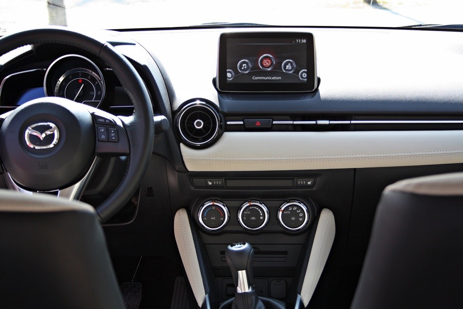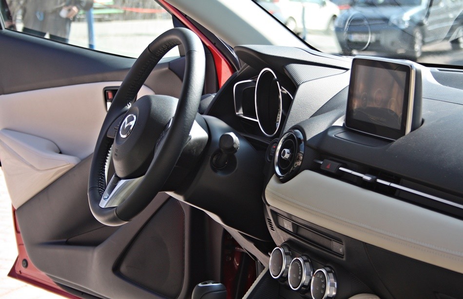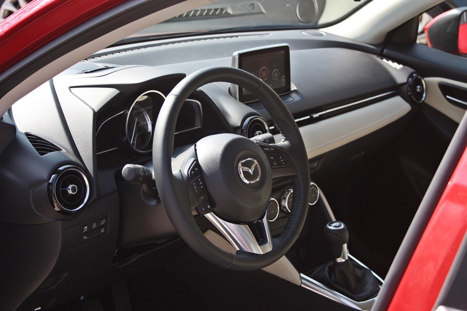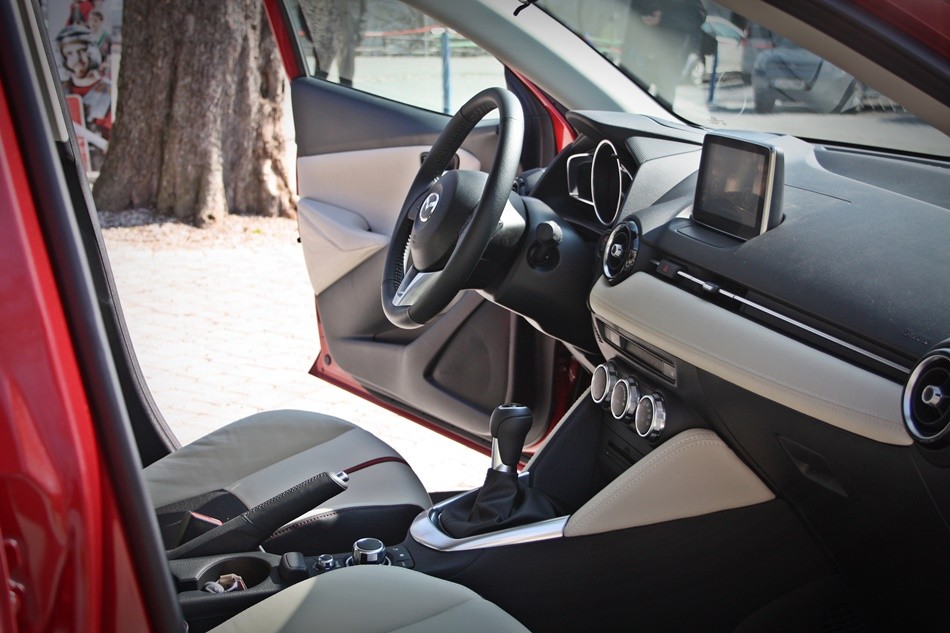Notranjost je bila tako kot zunanjost pričakovano ukrojena povsem na novo, kar se tiče zasnove sredinske konzole, pa vidimo tudi odmik od aktualne mazdine notranje arhitekture. Konzolo namreč objema le en okrogli zračnik na levi strani, medtem ko je desnega zamenjal takšen pravokotne oblike, s čimer so poskrbeli da ta del notranjosti ne deluje toliko natrpano. Glede skladnosti se bodo sicer v prihodnje kresala mnenja, nekaj pa zagotovo drži, da je nova dvojka dobila veliko kakovostnejše materiale in bolj premium občutke notranjosti, slednje je sicer v doberšnji meri povezano s paketom opreme.