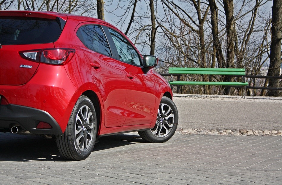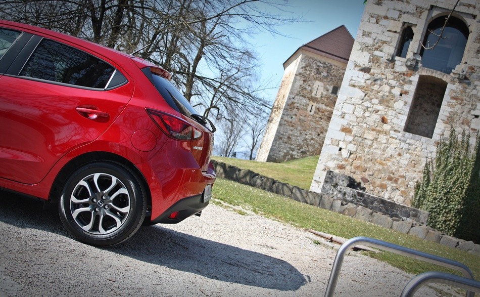 Z boka mazda 2 sicer ne spominja več toliko na večjo modelno sestro mazda 3, kar je glede na mere in zasnovo razumljivo, preseneti pa izredno dinamična bočna linija in enako zaključen zadek, ki pa za seboj potegne podpovprečno preglednost vstran in nazaj. Nova mazda 2 se je sicer potegnila v praktično vse smeri, kjer meter po novem v dolžino pokaže 4.060 milimetrov ali 140 več kot prej. Tudi medosje je pridobilo in sicer 80, višina pa 20 milimetrov. Edini nespremenjeni aspekt je ostala širina, kjer se številka ustavi pri 1.695 milimetrih.