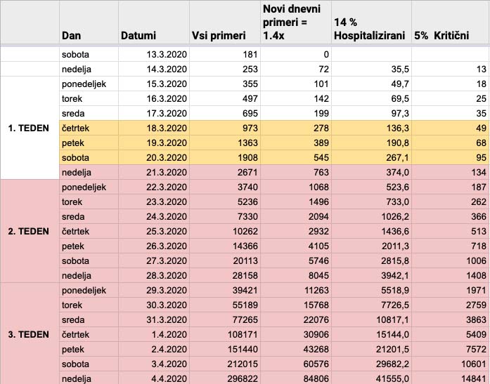 Torej, če poznamo osnovno matematiko in optimistično ocenjujemo, da se število okuženih vsak dan pomnoži s faktorjem 1.4, lahko ocenimo, da bo v roku 7 dni hospitaliziranih minimalno 200 obolelih za COVID-19. Od teh 200 obolelih pa jih bo tretjina potrebovala ventilatorje za predihavanje/respiratorje. Konec prihodnjega tedna bomo torej potrebovali nekje 60 respiratorjev za obolele s COVID-19. Na razpolago pa jih imamo le med 20 in 30. To so trenutne proste kapacitete (od 168 respiratorjev v državi jih je prostih po ocenah nekje 20 do 30). Slednje bodo, če upoštevamo trenutno rast obolelih, pošle že ta četrtek (19. marca 2020). Takrat se bo število umrlih drastično povečalo. Umirali bodo Slovenci!