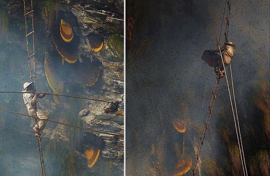 Dvakrat letno se čebelarji nepalskega plemena Gurung povzpnejo k vznožju klifov, kjer jih čaka to sladko presenečenje. In ravno njihovo delo se je v objektiv odločil ujeti angleški fotograf Andrew Newey. Nepalci še vedno uporabljajo tradicionalno orodje, ki so ga uporabljali že njihovi predniki – ročno pletene lestve, dolge in ostre bambusove palice, ki jih uporabljajo, da panje, polne medu, odrežejo s stene, ti pa padejo v že pripravljene košare. Po tem, ko z dimom preženejo čebele, pa splezajo h košaram in vzamejo težko prigarani med.