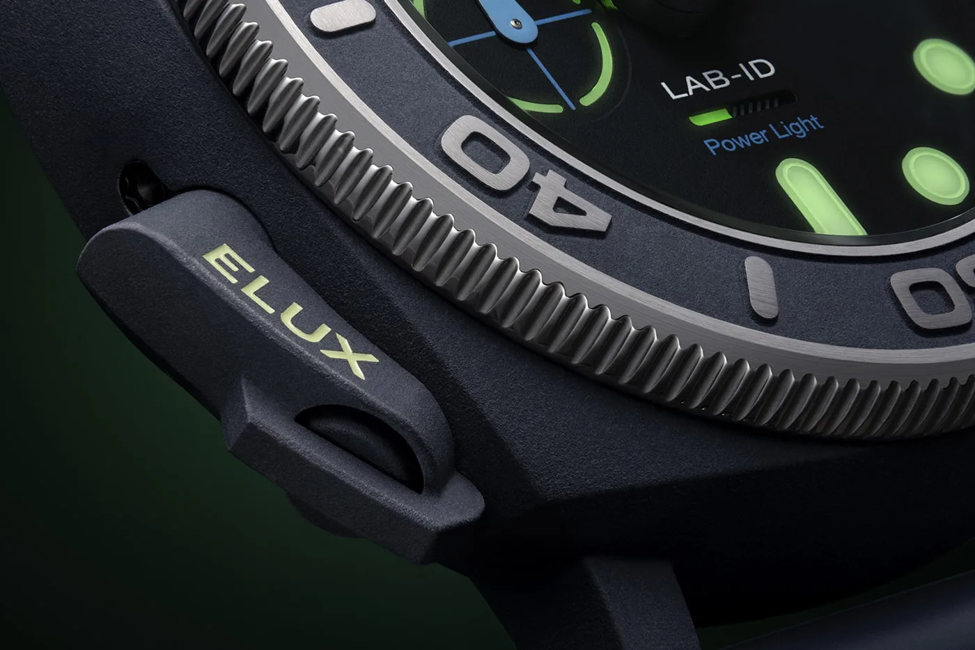 Jedro nove ure Elux LAB-ID je njena osvetlitev in vidljivost v vseh svetlobnih pogojih. Zahvaljujoč funkciji Power Light, ki se aktivira na zahtevo, lahko osvetlitev traja do 30 minut. Aktiviranje je enostavno – s pritiskom na poseben gumb na ohišju pri 8. uri, ki je zaščiten z patentiranim sistemom za zaščito gumbov. Ta energija osvetli 12 indeksov na številčnici, patentirane kazalce in točko na enosmerno vrtljivem obroču.