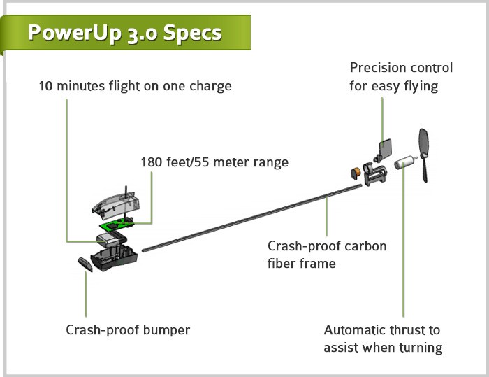 PowerUp se je začel kot navaden propeler na letalu, ki ga izdelamo sami iz A4 papirja ali lahkega kartona. Ta komplet lahko tudi kupite, če prispevate za projekt na Kickstarterju. Goitein ima cilj zbrati dovolj sredstev za razvoj Bluetooth modula, ki bo omogočal nadzor aviončka preko pametnega telefona. Sprva je bilo načrtovano predstaviti »PowerUp 3.0« že oktobra letos, vendar bo zdaj na voljo spomladi, ko se bomo otresli zime in se bomo pripravljeni igrati zunaj.