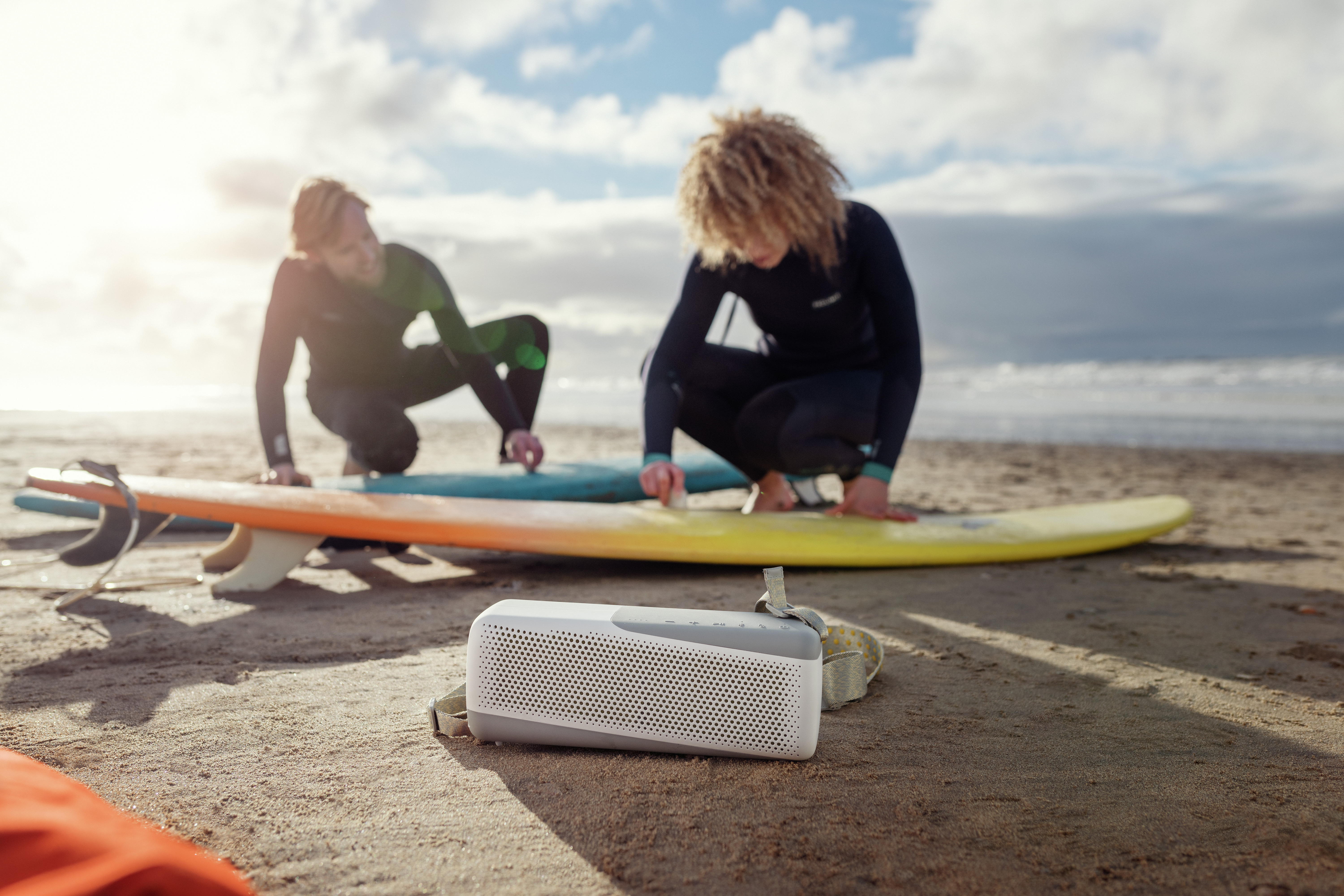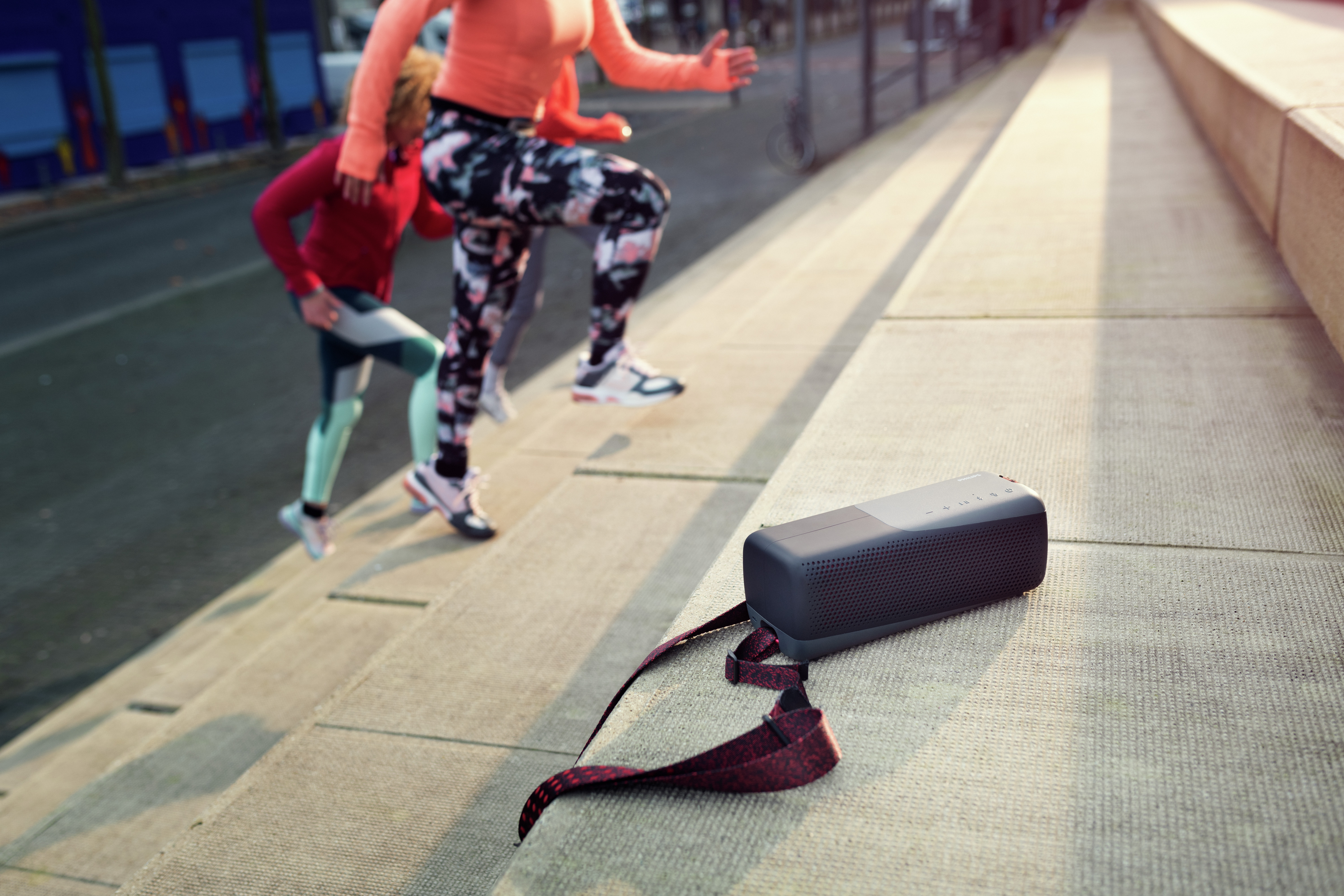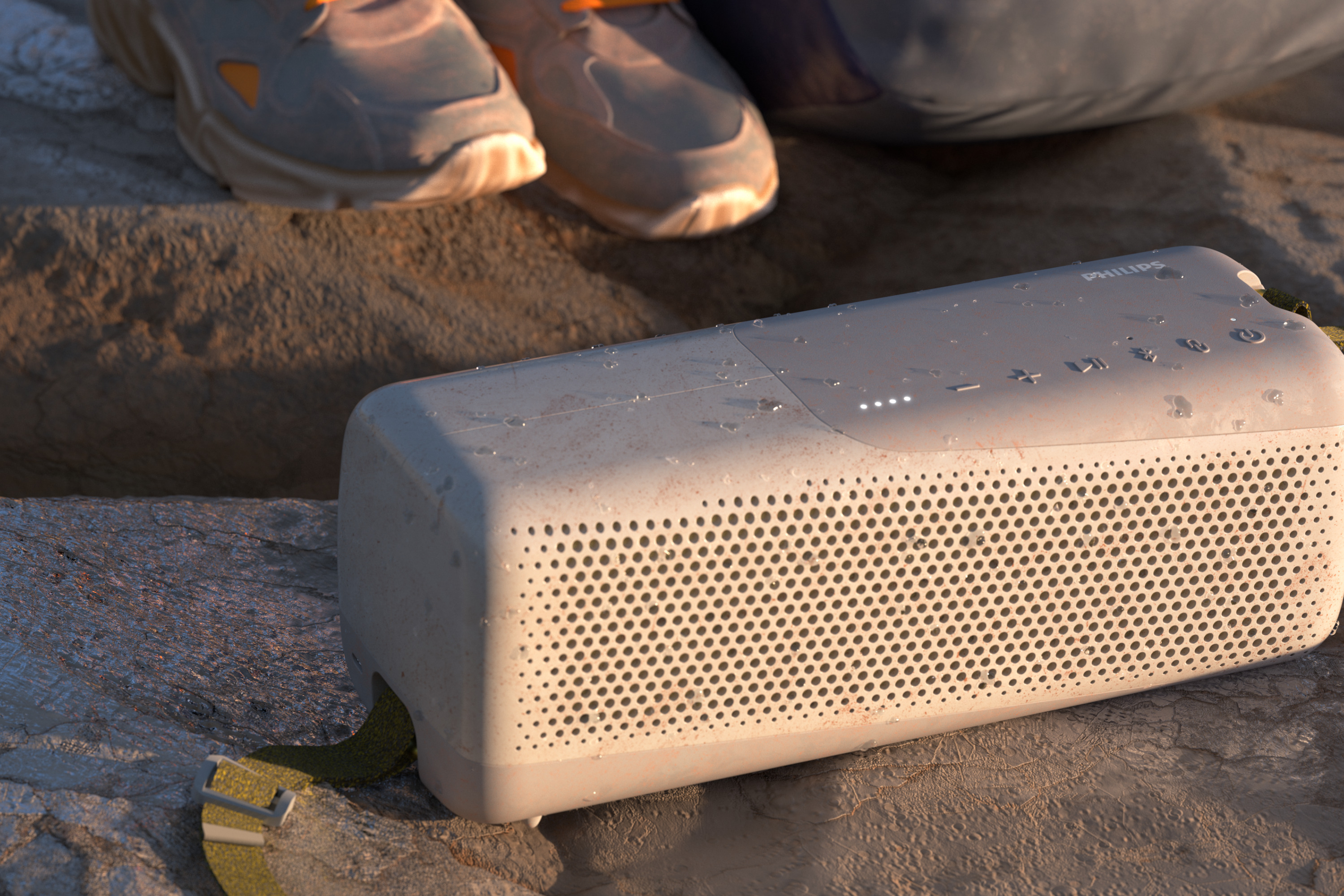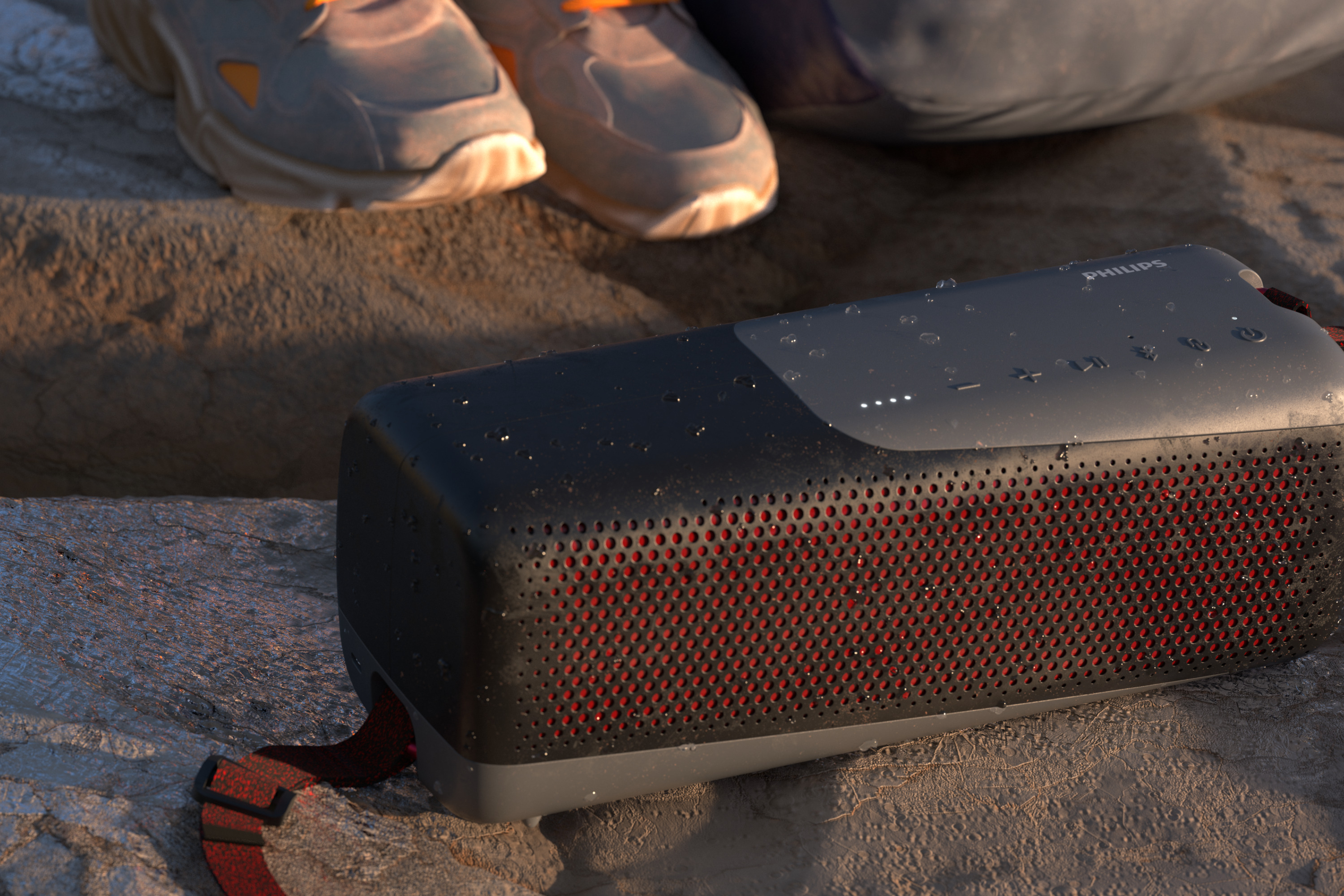 Ta prenosna zvočnika lahko zahvaljujoč njuni zasnovi vzamete kamor koli – odporna sta na prah in vodo – mogoče pa ju je uporabljati v vseh pogojih. Robustna dvoslojna gumijasta prevleka je na voljo v črno-rdeči ali belo-rumeni elegantni barvni kombinaciji, s sivimi poudarki in integrirano snemljivo vrvico.