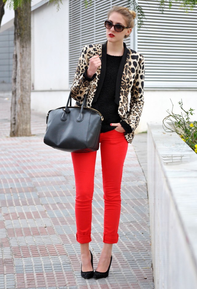 Opaznemu leopardjemu vzorcu se – poleg črne, bele in jeansa – izjemno dobro poda rdeča, ki naj obarva naše ustnice ali pa zažari v obliki “clutch” torbice v naši roki. Vibranta kombinacija je privlačna za divji večer s prijateljicami, popolnoma brez strahu pa si jo lahko privoščimo tudi za vsakdanji videz. Pazimo le, da ju kombiniramos sicer nevtralnim ozadjem.