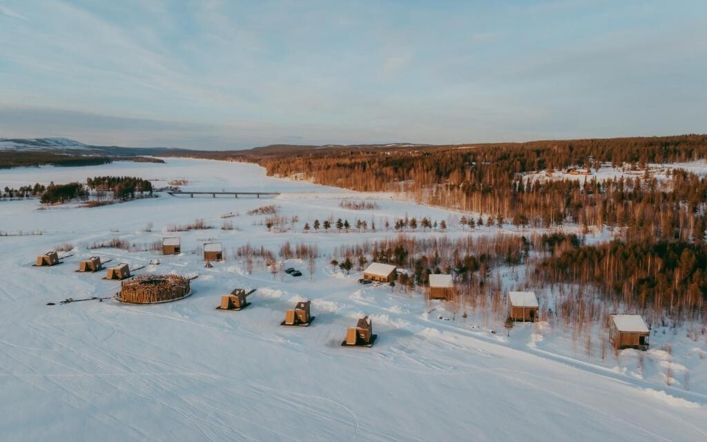 Bajkowe wellness w dziewiczej skandynawskiej przyrodzie w Laponii to coś naprawdę wyjątkowego. Uzdrowisko w kształcie ptasiego gniazda unosi się na szczycie lokalnej rzeki, uzupełnione minimalistycznymi domkami z przeszklonymi fasadami rozrzuconymi na brzegach lub wśród brzóz.