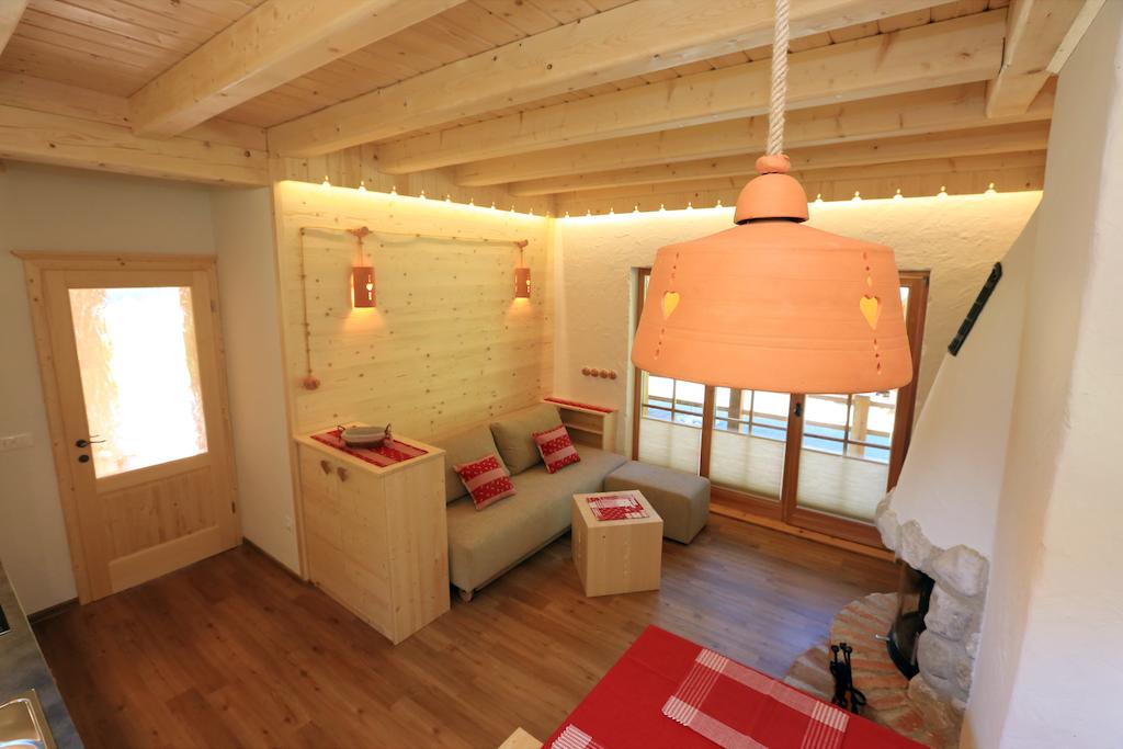 Wnętrze wykończone jest jasnym drewnem. Na parterze znajduje się salon zw pełni wyposażoną kuchnią, łazienka, jadalnia i żelazny piec. Schody prowadzą na piętro, gdzie znajdują się dwie sypialnie. W każdym z nich znajduje się jedno łóżko podwójne oraz dodatkowe łóżko pojedyncze. W sumie jest miejsce dla sześciu osób.