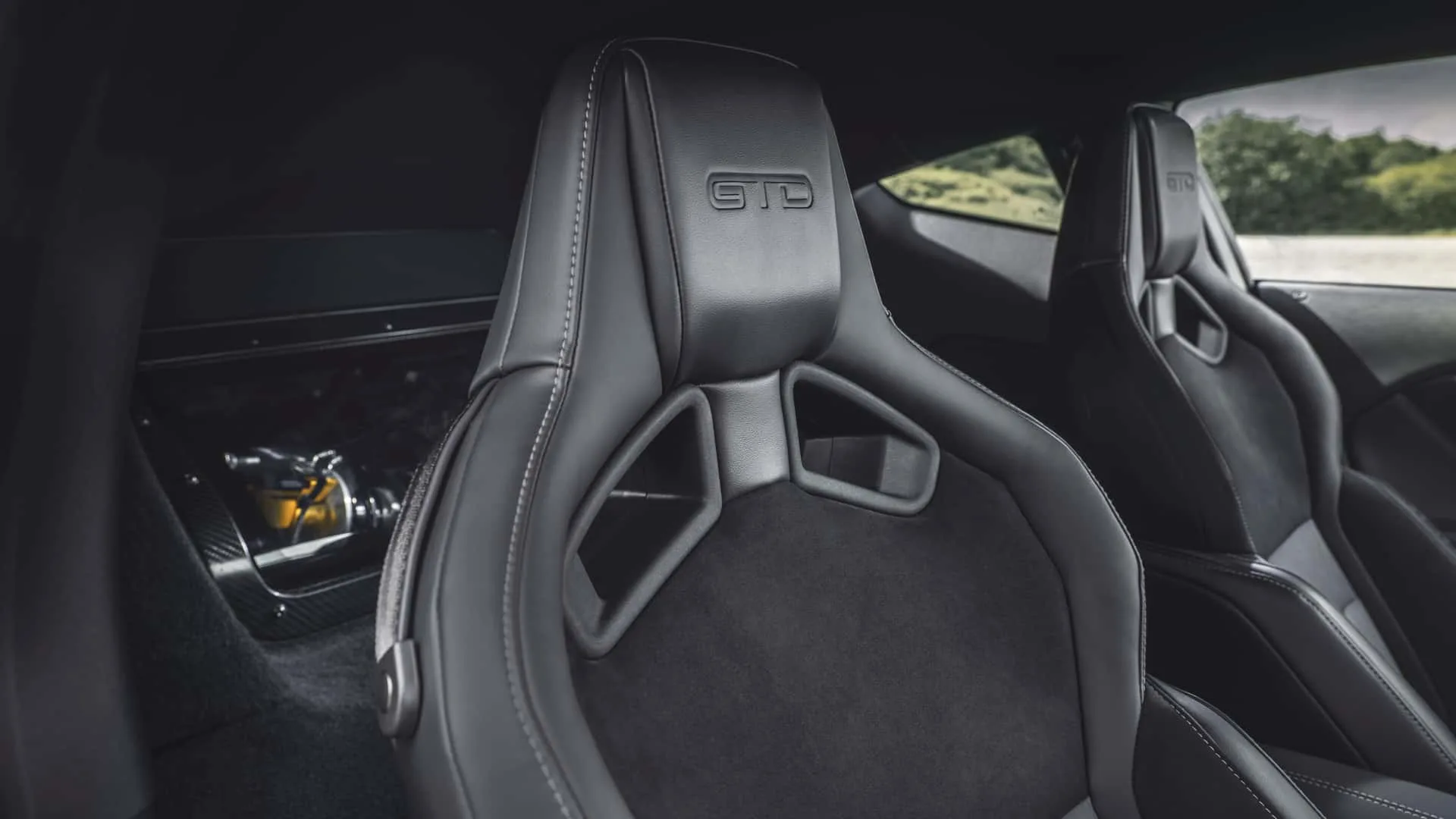 Wewnątrz Mustang GTD zachował rozpoznawalny wygląd Mustanga, z akcesoriami pasującymi do jego statusu premium. Standardowe fotele Recaro, specjalne wyświetlacze graficzne na ekranach i tytanowe dźwignie zmiany biegów tworzą prawdziwie wyścigową atmosferę. Na konsoli środkowej znajdują się dwa nowe przyciski: jeden umożliwiający dostęp do aplikacji Track i drugi umożliwiający aktywację funkcji podnoszenia przedniej osi. Specjalna kierownica GTD i przezroczysta tylna szyba umożliwiają widok na tylne zawieszenie, podkreślając zaawansowanie technologiczne tego pojazdu.