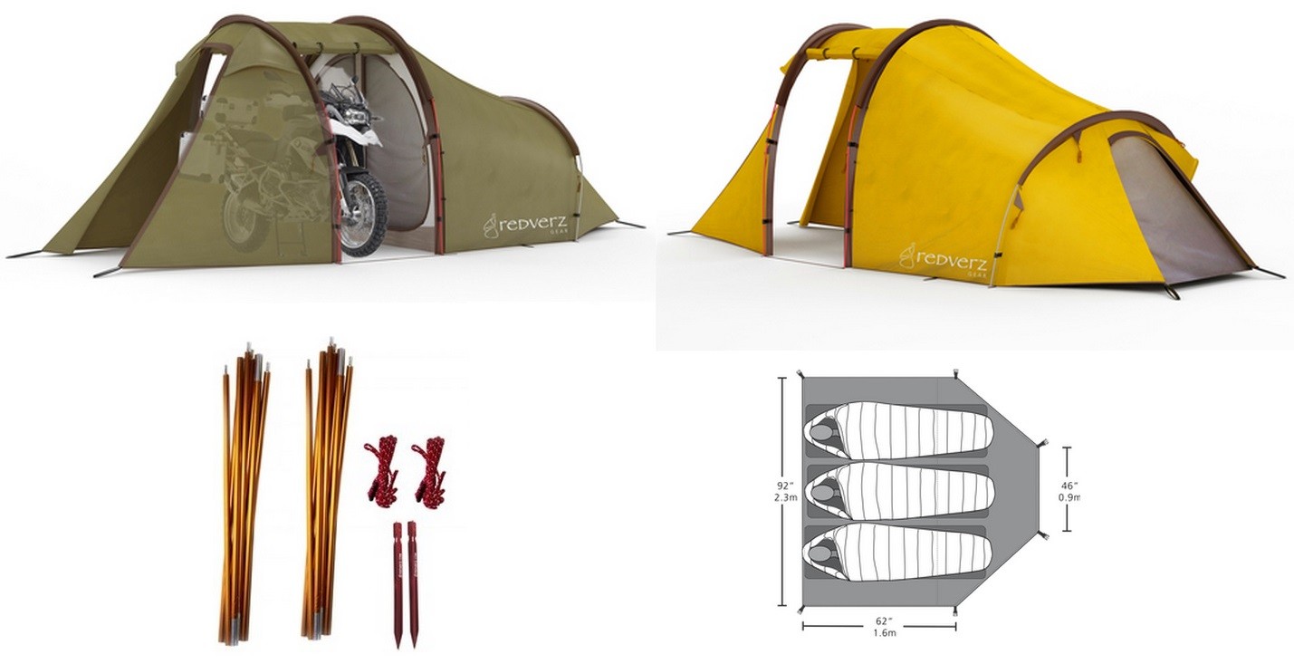 Šotor z ”garažo” za motocikel, Atacama Expedition Motorcycle, który przygotował o Rederzu poleg motocikla daje prenočišče še trem odraslim osebam, krasi pa ga tudi predprostor, kamor lahko shranimo opremo (od čelade, čevljev, orodja, do vse ostalega). Ima tudi mrežo proti komarjem, veliko žepkov in možnosti za obešanje stvari. Če se kdaj na kampiranje odpravite brez motocikla, pa lahko šotor sestavite tudi brez posebnega prostora dla niego.