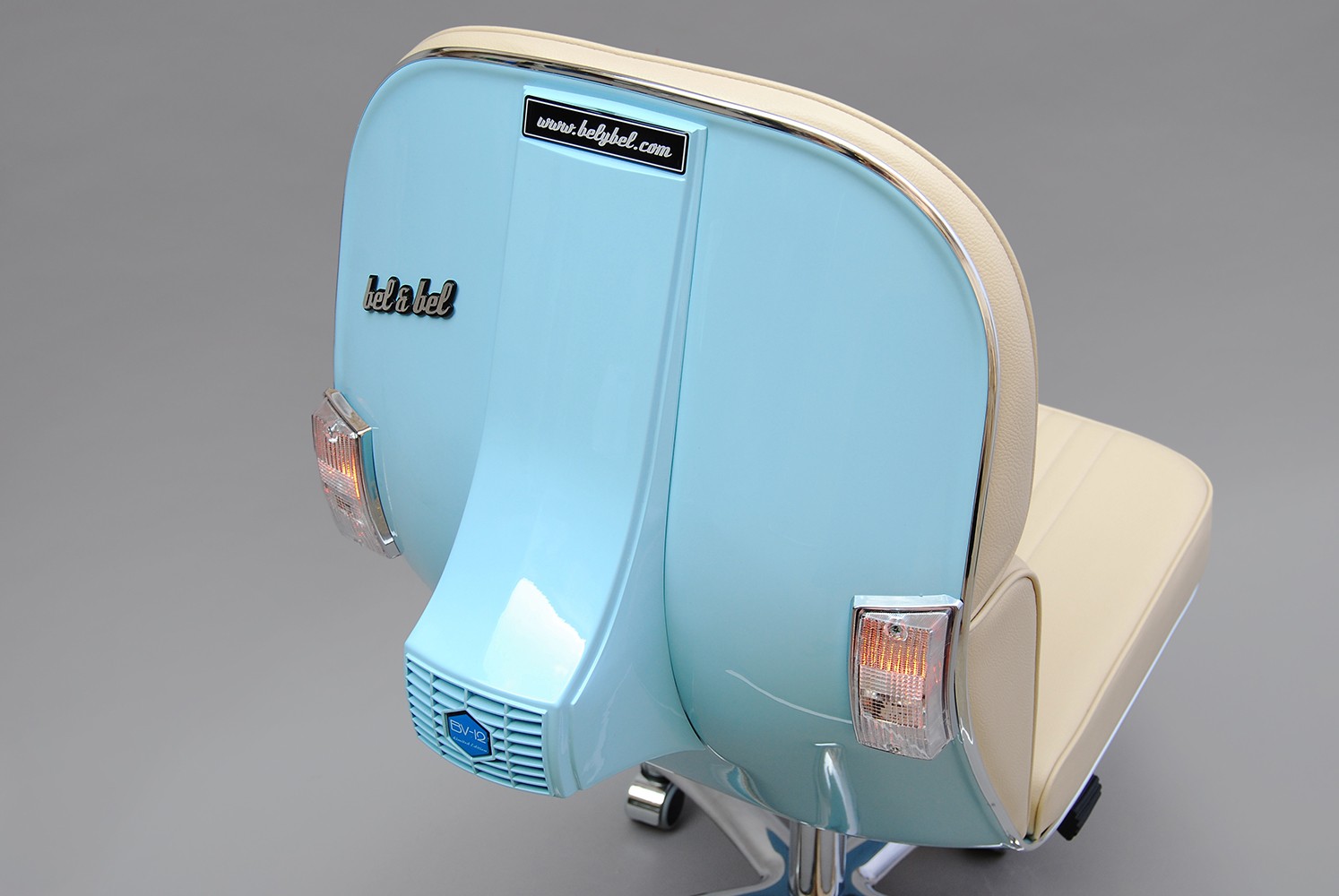 Krzesła biurowe Bel&Bel wykonane są z oryginalnych części legendarnego włoskiego skutera Vespa z lat 80-tych. Wykorzystując ponownie podwozie, firma z Barcelony stworzyła oryginalne i niepowtarzalne krzesło obrotowe.