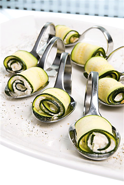 SKŁADNIKI: 1 cukinia, 10 dkg pełnotłustego twarogu, 3 łyżki kwaśnej śmietany, szczypta soli i wyciśnięty sok z limonki, 1 łyżka oliwy z oliwek, 5 dkg orzeszków pinii PRZYGOTOWANIE: Cukinię pokroić w cienkie listki . Ze wszystkich innych...