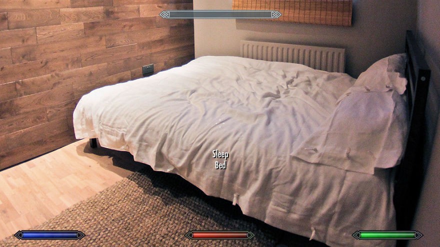 Domišljija ilustratorja Adama Ellisa ne pozna meja. Vsaj tako se zdi ob pregledu njegovega fotografskega projekta, ki predstavlja kako bi izgledalo naše vsakodnevno življenje skozi oči igralca popularne računalniške igrice The Elder Scrolls: Skyrim. Ko nas ne ogrožajo zmaji in ostale podobne grozote, se zdi življenje v računalniški igrici kar malce dolgočasno. Toda bodimo brez skrbi, nadarjeni ilustrator zna spremeniti tudi popolnoma običajen dan v nekaj ekstremno zabavnega. Komaj čakamo, da nekdo izumi tovrstno igro, oziroma še bolje, računalniško igrico, v kateri bomo morali delati. Zagotovo jo bomo igrali med delom.