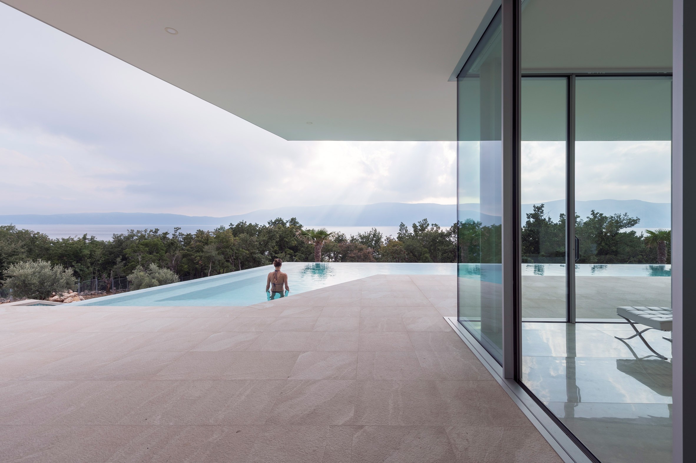 Układ dzieli go na "część prywatną i publiczną", ale w międzyczasie oferuje doskonałe widok na Morze Adriatyckie i uzupełnia otoczenie. Część "ogólnodostępna" zlokalizowana jest po wschodniej stronie działki i posiada dużą otwarty salon, jadalnia, który otwiera się na przestronny taras i basen. Część „prywatna”, w której też się znajdują dwie sypialnie, każdy z własnym wejściem, jest nieco podwyższony i cofnięty od basenu.
