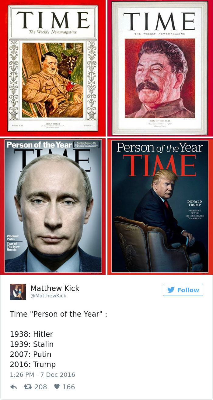 Kot da Donald Trump že sam po sebi ne bi dvigoval dovolj prahu, so se pri reviji Time spretno poigrali z njegovim portretom in črko M iz naziva revije, ki spominja na rožičke. Namerno ali naključje? Tega verjetno ne bomo izvedeli nikoli. V ožjem izboru za osebnost leta so bilo tokrat še Hillary Clinton, turški predsednik Recep Tayyip Erdogan i piosenkarka Beyonce. V preteklosti so bile Timeove osebnosti leta med drugim britanska kraljica Elizabeta II., Mark Zuckerberg, Adolf Hitler, Nelson Mandela, John F. Kennedy, Lech Wałęsa, računalnik, Barack Obama, mirovniki, žvižgači, leta 2006 pa smo bili osebnost leta vsi mi (”Ty”).