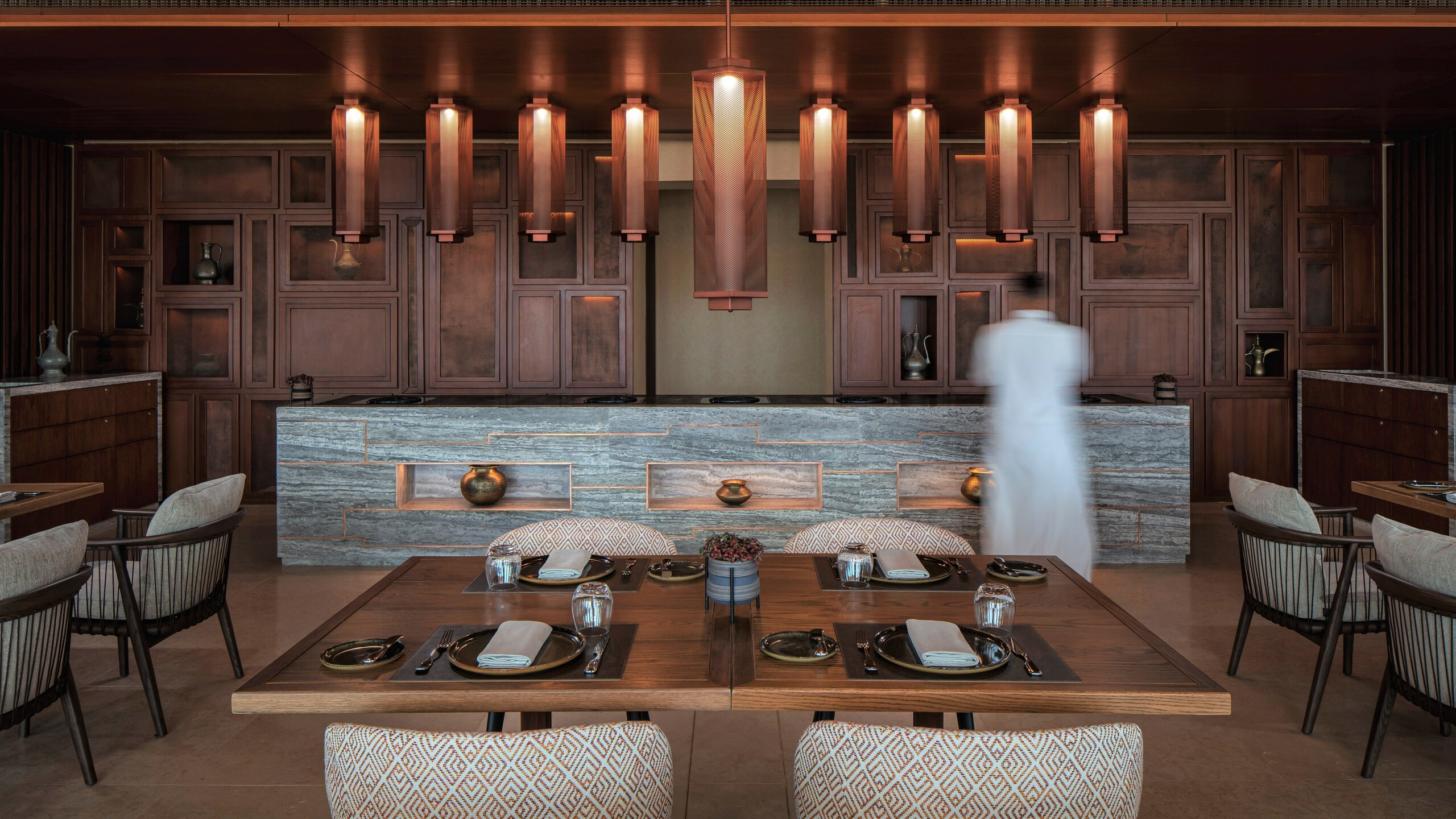 Wnętrze willi przypomina medytację Zen – minimalistyczne i wyciszające. Sufity naśladują schody na szczycie grobowców Nabatejczyków w Hegrze, jakby miały zabrać cię do nieba (lub przynajmniej do niebiańsko wygodnych łóżek). Paleta kolorów piasku i terakoty służy jako płótno dla prac saudyjskich artystów, które wykorzystują elementy lokalnego dziedzictwa, takie jak tkaniny Sadu, stroje Beduinów i rodzime rośliny.