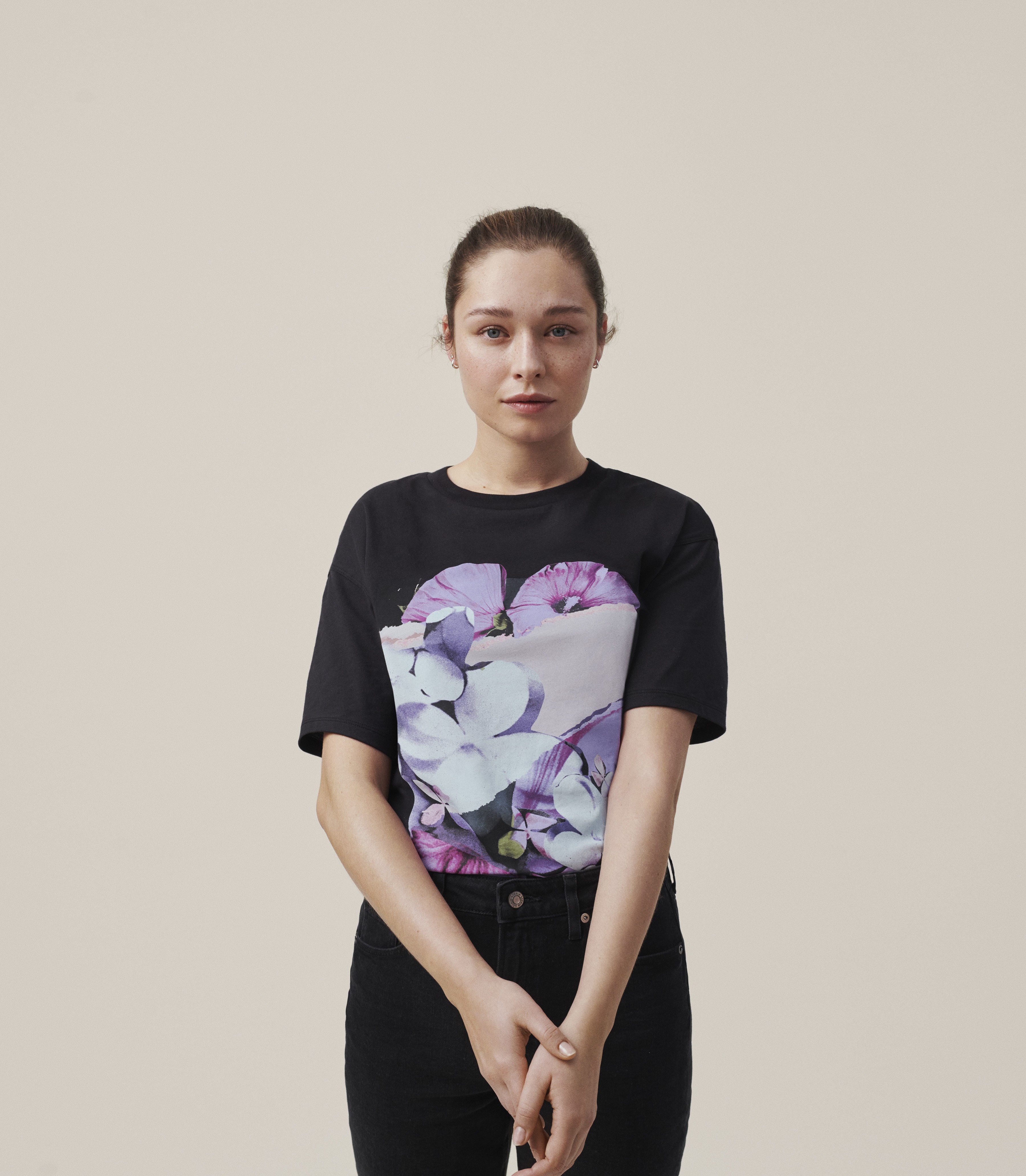 Kolekcja kapsułek Helena Christensen x H&M, która składa się z t-shirty, bluzy dresowe i bluzy z kapturem, ma słodkie, ale bezczelne wibracje. Sylwetki obejmują luźne koszulki, przycięte topy dresowe i (za duże) bluzy z kapturem. Paleta kolorystyczna obejmuje biel, czerń i szarość, która jest doskonałym tłem dla zdjęć Heleny z różnymi kwiatami. Kolekcję można kupić od dzisiaj online.