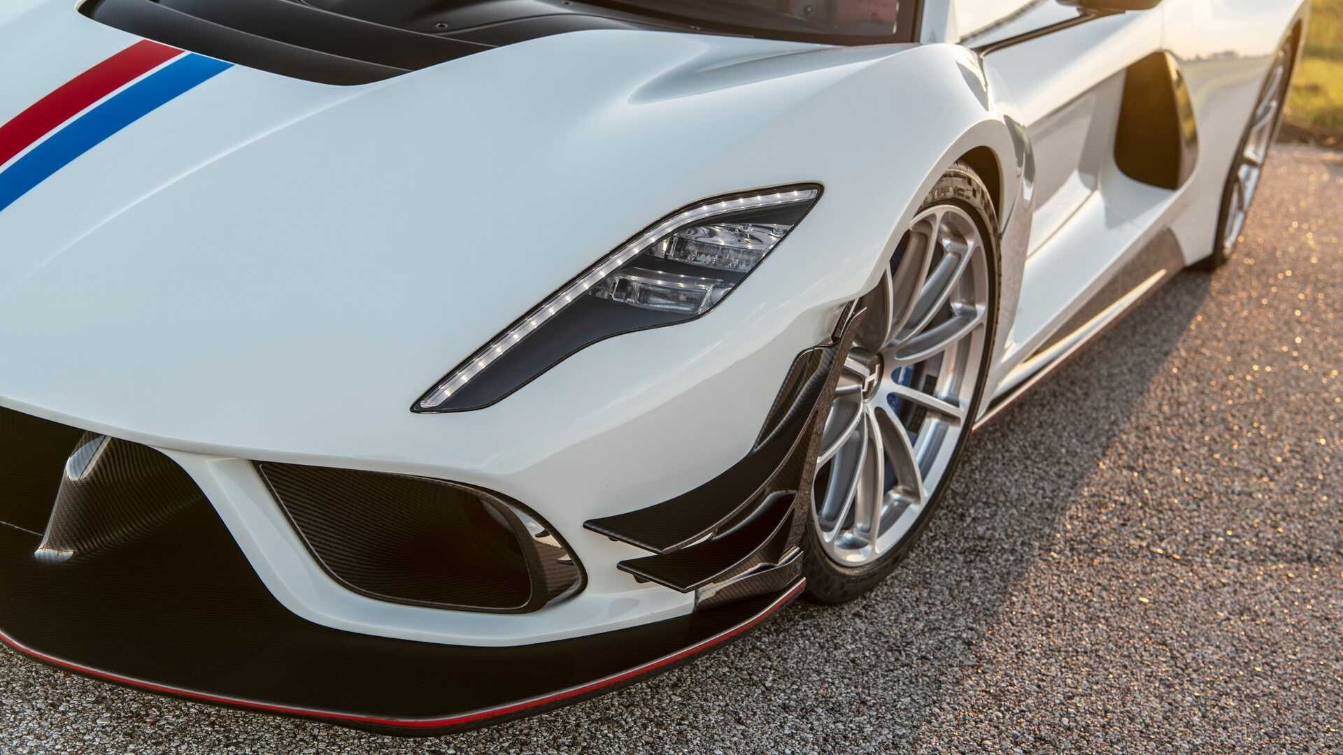 Hennessey w tym celu znacznie poprawił aerodynamikę i zawieszenie samochodu Rewolucja F5 uzyskał przewagę konkurencyjną. Duże regulowane tylne skrzydło z panelami końcowymi zapewnia więcej niż 362 kg (800 funtów) siły ściskające przy 300 kilometrów na godzinę (186 mph), co wzrasta do niewiarygodnego 635 kg (1400 funtów) Na 400 kilometrów na godzinę (249 mph). Większy przedni rozdzielacz i tylny dyfuzor pomagają ukierunkować przepływ powietrza, podczas gdy nurkujące płaszczyzny na przednim panelu zapewniają przyczepność i lepsze pokonywanie zakrętów. Zamontowany na dachu czerpak wlotu powietrza dostarcza do komory silnika dużo chłodnego powietrza.