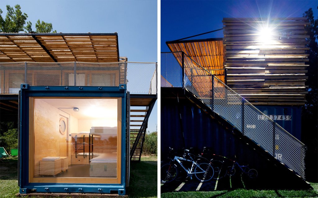 Dwa 6-metrowy I Kontener 12-metrowy tworzą łazienkę, toaleta, miejsce na garderobę i 4 sypialnie. Każda sypialnia posiada przeszkloną ścianę z wyjściem na drewniany taras. Wnętrza pokoi wykonano ze sklejki brzozowej, a na dach wykorzystano drewno pochodzące z recyklingu, dzięki czemu latem w środku panuje przyjemna temperatura. Hotel, który powstał w zaledwie 4 miesiące, akceptuje 12 gości i bez wątpienia jest to projekt, o którym będziemy musieli pomyśleć w przyszłości, jeśli chcemy utrzymać środowisko w lepszym stanie.