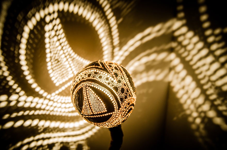 Artystka czerpie inspiracje z twórczości artysty Kalabria i codziennym życiu, a stworzenie światła zajęło mu dziewięć miesięcy. Z czasem i nauką doskonalił swoje umiejętności, które dziś pozwalają mu szybciej i dokładniej produkować piękne lampy. Główka lampy kokosowej wykonana jest z oszlifowanego i lakierowanego kokosa, który błyszczy jak klejnot. Umieszczona jest na stojaku, który owinięty skórą wygląda nieco odstraszająco, co jednak zdecydowanie nie ogranicza magii zapalonej lampy.