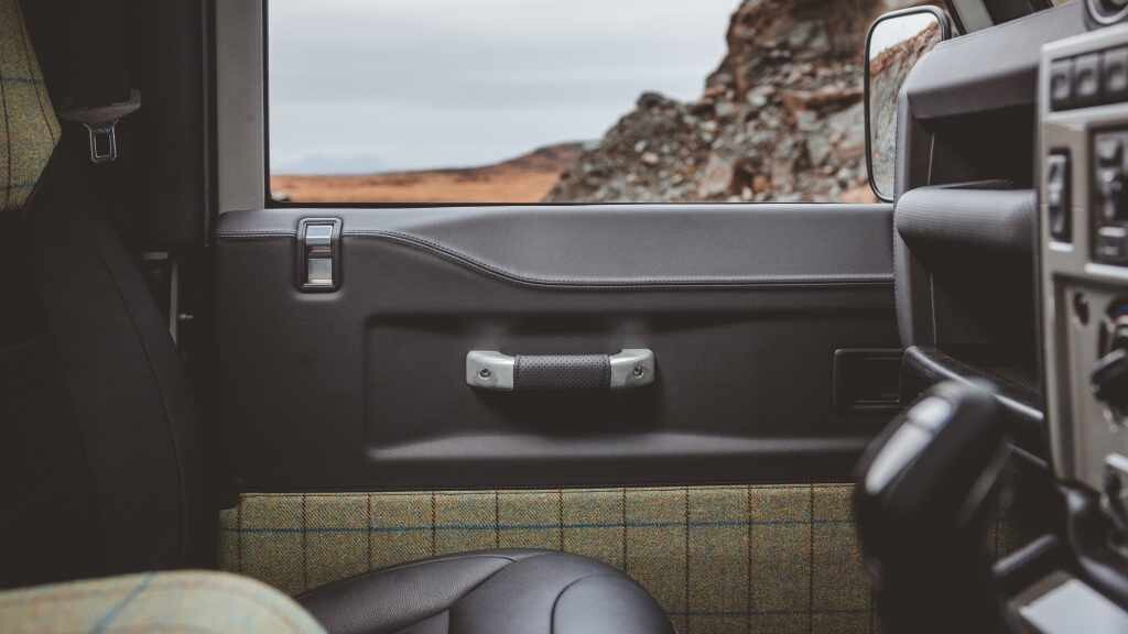 Wnętrze jest wyrazem przywiązania Land Rovera do detali i autentyczności. Luksusowa skóra Windsor Ebony pokrywa siedzenia, panele boczne, drzwi, podsufitkę i deskę rozdzielczą. Klasyczny system informacyjno-rozrywkowy, wraz z nawigacją satelitarną, radiem DAB i Bluetooth, mieści się w oryginalnym wyświetlaczu i płycie czołowej. Dźwignia zmiany biegów w kolorze Heritage Grey zdobi uchwyt pistoletowy, a plakietka opowiada o pochodzeniu nazwy Land Rover.