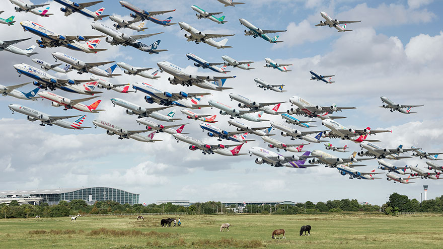 Ruch lotniczy jest niezwykle ożywiony. Świadczą o tym również zdjęcia Mike'a Kelleya, który uchwycił starty samolotów na osiemnastu różnych lotniskach na całym świecie i połączył poszczególne zdjęcia w jedno, które pokazuje, jak gęsty jest ruch lotniczy, a nie tylko przysłowiowy .