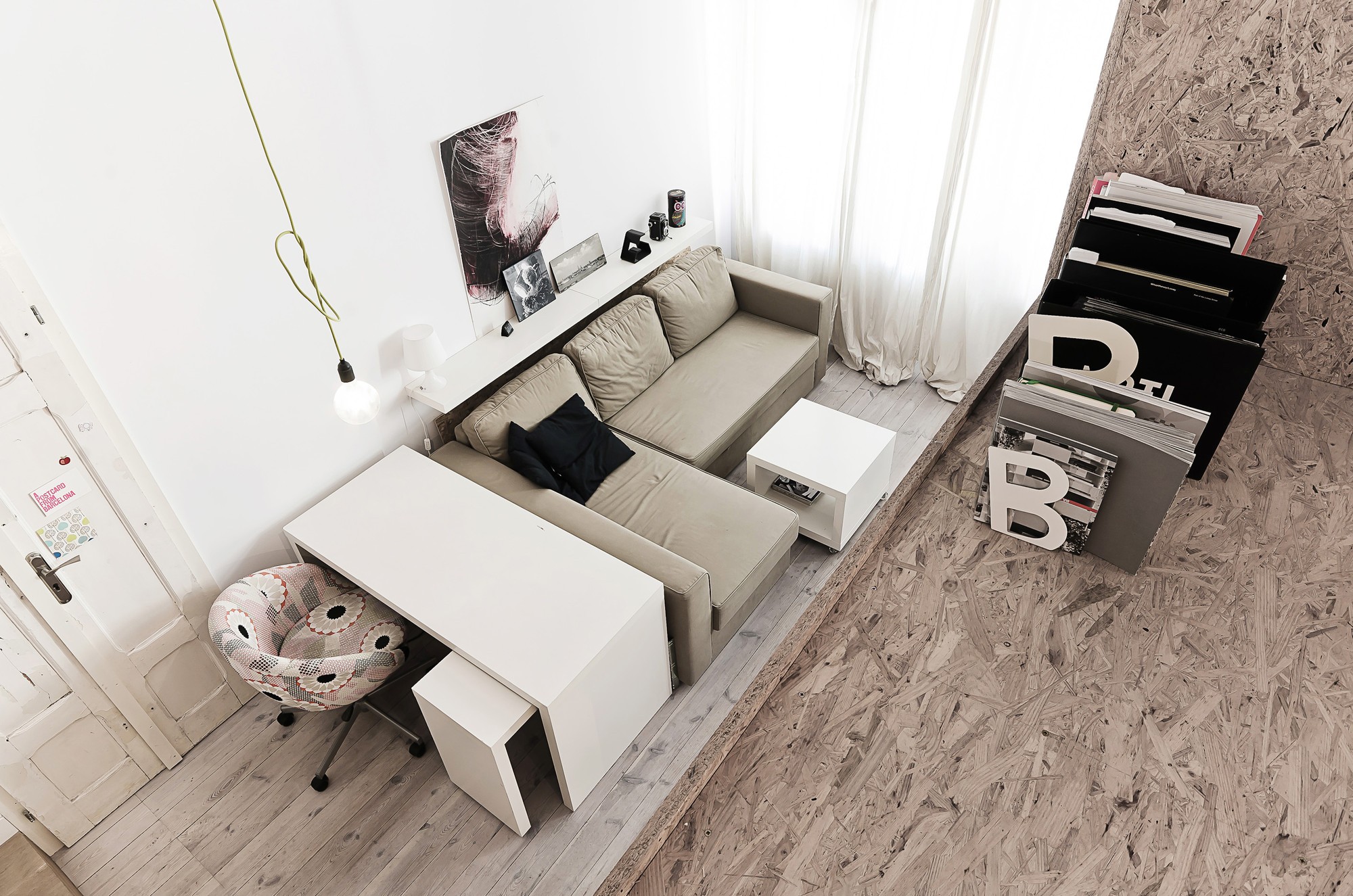 Ta garsonjera se nagiba k trajnostni zasnovi zunaj in k naravni, ekološki zasnovi znotraj. Tkane teksture ustvarijo sproščeno, dobrodošlo vzdušje, pisane blazine pa dodajo še nekaj osebnosti.