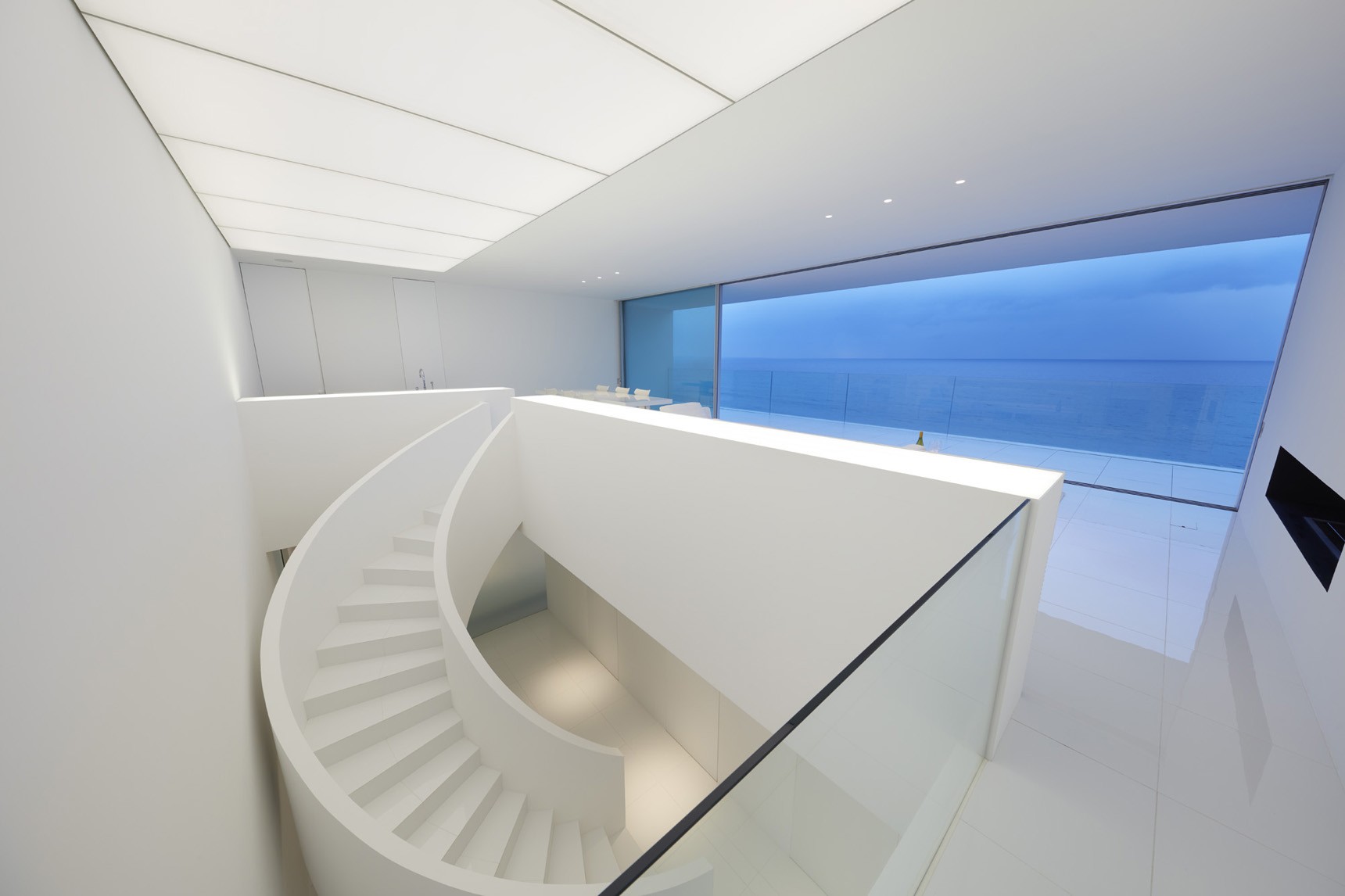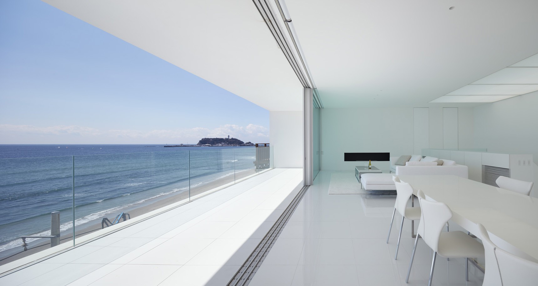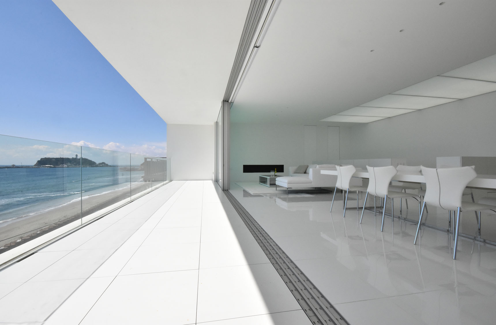 Šiniči Ogava je skupaj s sodelavci oblikoval bolj kot ne podolgovato počitniško hiško, ki jo krasi predvsem velika steklena stena oz. drsna vrata, ki vodijo na zunanjo teraso. To niti ne preseneča, saj so prostori obrnjeni proti morju. Notranjost in zunanjost sta oblečeni v belo keramiko, tako da se zdi, kot da je hišica iz enega kosa. Vgrajene luči, opremljene z velikimi pravokotnimi razpršilci, oddajajo svetlobo, zelo podobno naturalny. Barvo svetlobe lahko prilagajate po potrebi in željah.
