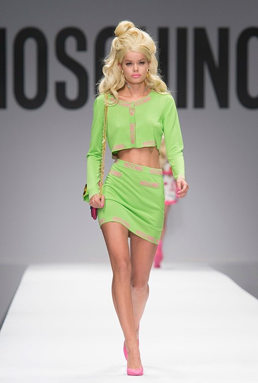 NA Tydzień Mody w Mediolanie byli na Moschinos Dziewczyny przeszły po wybiegu podczas pokazu mody lalka Barbie w ludzkiej skali. Modelki, ubrane głównie w różowe kreacje, zaskoczyły mocnym makijażem, platynowymi lokami i autentyczną prezentacją w klasycznym stylu Barbie. Jedna z nich pojawiła się na wybiegu na rolkach, inna przyniosła ze sobą różową plastikową walizkę.