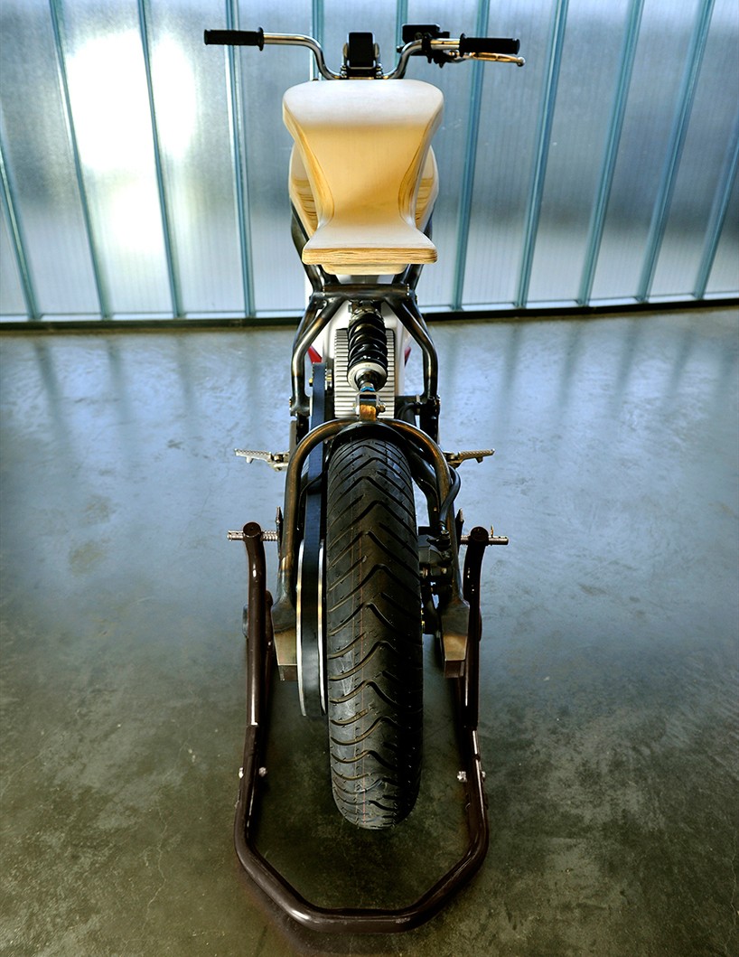 E-raw to motocykl elektryczny co bardziej przypominałoby pracę stolarza, który jest pasjonatem motocykli, niż inżyniera. Jego nadwozie jest częściowo wykonane wykonany z kształtowanego drewna (Nadal spodziewamy się go w samochodzie, ale na motocyklu?). No cóż, wyjechał z garażu (firmy Wyprawa) a nie warsztaty stolarskie i reprezentuje harmonia mechaniki i elektroniki, a swoim wyglądem przekracza granice tradycji. Nie stoi za tym cieśla, ale projektant Martin HulinCzerpał inspirację z klasyczne motocykle i motocykle café racer, a dzięki e-raw znalazł wspólny mianownik między językiem nowoczesnej technologii a cechami przeszłości.