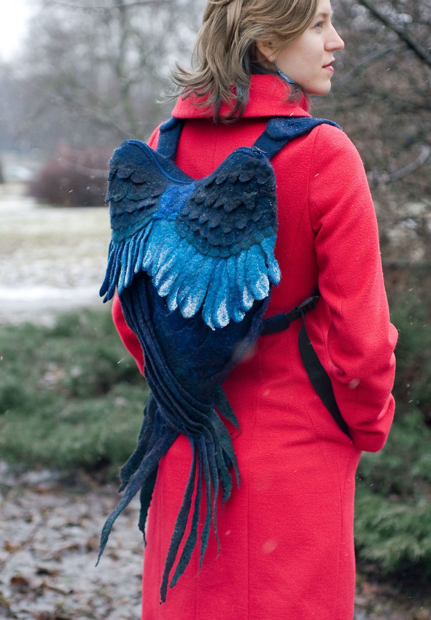 Nahrbtniki s krili so izdelani iz ovčje volne (z zadrgo) in so po eni strani praktyczny, po drugi pa umetnine s posluhom za detajle. Pozimi pa še dodatno grejejo hrbet. Svojega lahko naročite w sklepie internetowym Etsy, vsak pa je izdelan ročno in po naročilu. Izbirate lahko med različnimi barvami kril – sivo, modro, belo in mavrično. Še nikoli ni bilo bolj preprosto in poceni živeti svoje sanje, ne da bi pri tem izpadli čudaško oz. kot da ste zamešali dneve na koledarju.