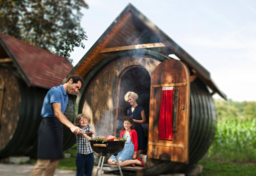 Noč lahko preživite v pravem lesenem vinskem sodu, ki priča o bogati vinarski tradiciji na Ptuju. Nevsakdanja, a izjemno prijetna in zanimiva bivališča, ki sprejmejo po dve osebi, so nameščena okrog osrednjega prostora s skupnim ognjiščem. Bivanje v sodih je priljubljena popestritev za pare in odlična zabava za družine in zaključene skupine, ki v Vinski vasi pogosto priredijo tudi kakšno praznovanje ali timbilding. Poleg bivanja se lahko razvajate v savnah v Termah, med vodnimi atrakcijami pa so bazen z valovi, počasna reka in sistem vodnih drč. Na voljo vam je kar osem toboganov na večnadstropnem stolpu.