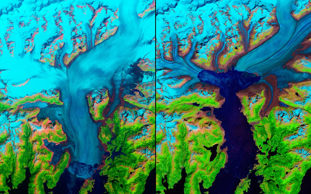 Nieco ponad sto lat temu jeden z pierwszych odkrywców wykonał pierwsze zdjęcia lodowca Muira na Alascew tym samym miejscu, które dziś jest nie do poznania. Do 2005 roku lodowiec całkowicie się skurczył i zniknął z pola widzenia, a góry pokryły się drzewami, a nie śniegiem i lodem.
