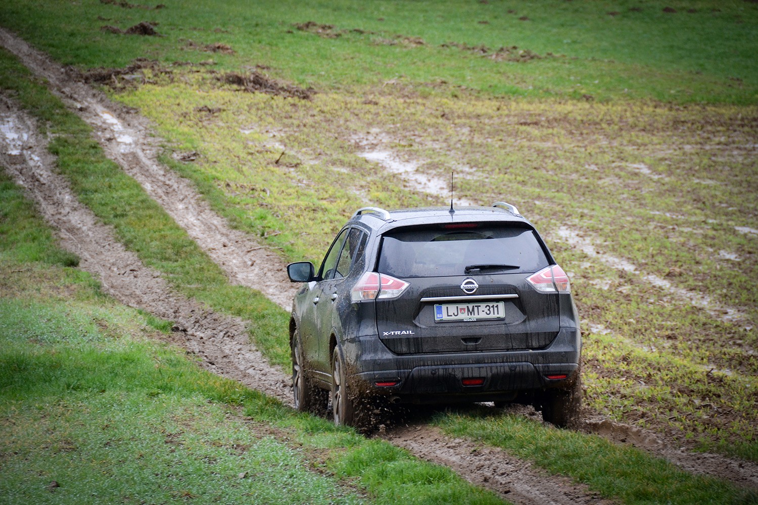 Napęd na cztery koła je tako kot pri predhodniku električni priključljivi, kar pomeni, da sta v osnovi gnani le prednji kolesi, po potrebi pa (v načinu auto) elektronska zapora diferenciala potrebno količino navora pošlje tudi zadnjemu kolesnemu paru. Voznik pa lahko preko vrtljivega gumba pogon tudi zaklene, v pomoč pa so mu tudi elektronska pomagala za varen spust po klancu in speljevanje vkreber. Z 21 centimetrskim odmikom od tal to pomeni, daje zmožen premagovati tudi težje prevozne terene, vendar ga kot v uvodu rečeno malce zaustavljata cestna obutev in 19-palčna platišča, kakor tudi dejstvo, da večina ne bo želela niti umazati svojega x-traila, kar šele poizkušati srečati meje njegovih terenskih zmogljivosti.