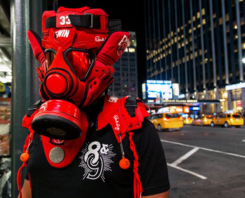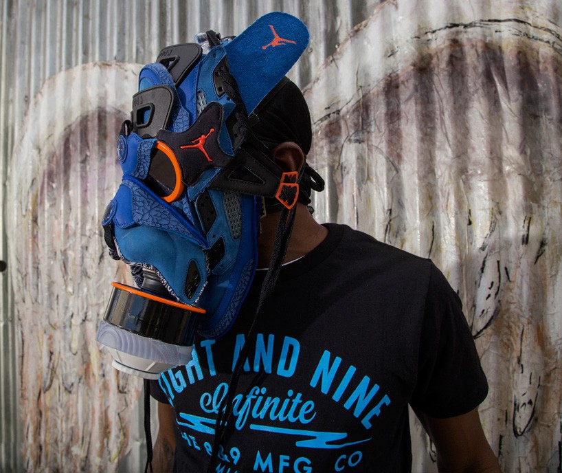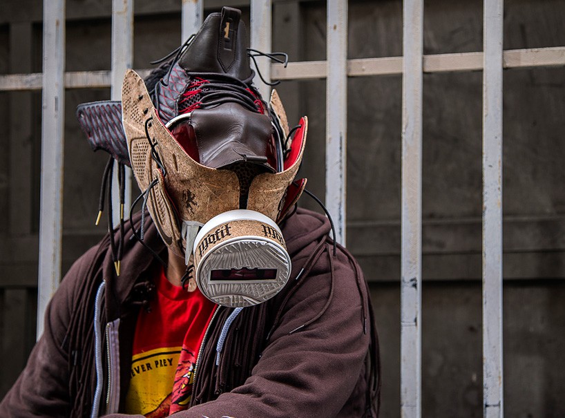 Artysta z Los Angeles Gary'ego Lockwooda Lub Odręczny zysk znalazł niezwykłą niszę rynkową. Maski i przyłbice wykonane z tenisówek.