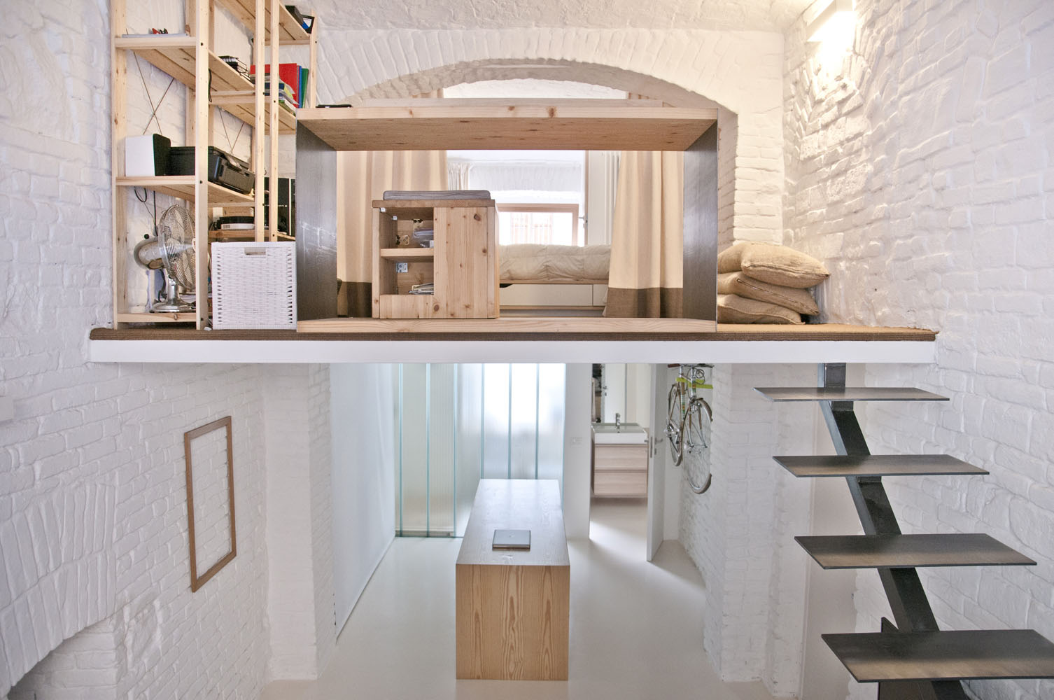 Bo ma małe, minimalistyczne mieszkanie, dawny sklep, w Turyn z zaledwie dwoma oknami architekci pomalowali ściany mieszkania na biało, zwiększając optycznie przestrzeń i jasność pomieszczenia. Zaznaczają przestrzeń cegły ścienne w kolorze białym I minimalistyczny drewniany meble. Ze względu na małą powierzchnię jest miejsce niezwykle wykorzystany. Na parterze mieszkanie jest mała kuchnia, łazienka i część dzienna, aw galerii małe miejsce do pracy i sypialnia oddzielona zasłoną.