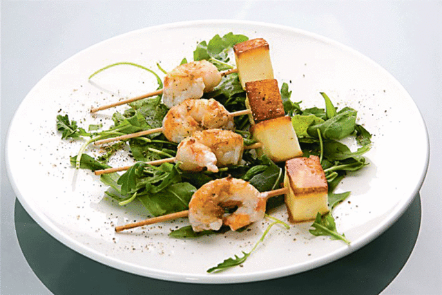SKŁADNIKI: 16 dkg oczyszczonych ogonków krewetek 16 dkg sera wędzonego 8 gałązek świeżego rozmarynu 10 dkg świeżej rukoli PRZYGOTOWANIE: Oczyszczone ogonki krewetek i większość kostek, ser cięty i wędzony, nabijamy na szaszłyki...