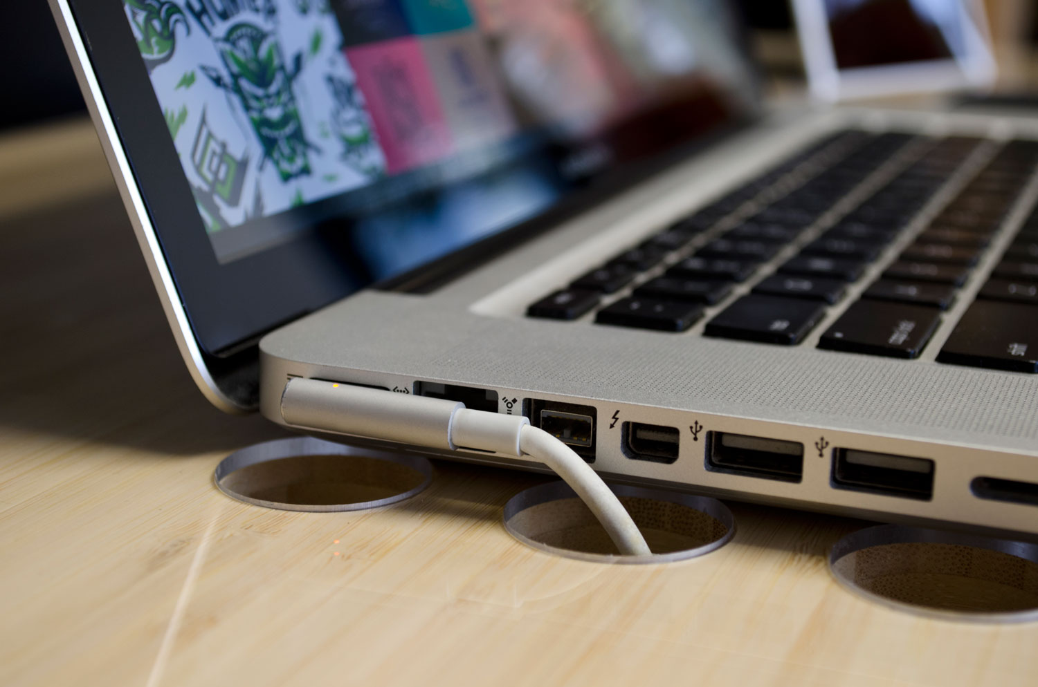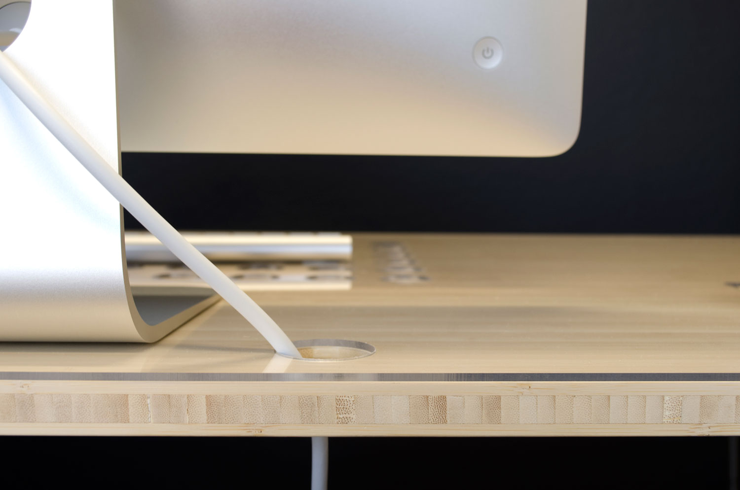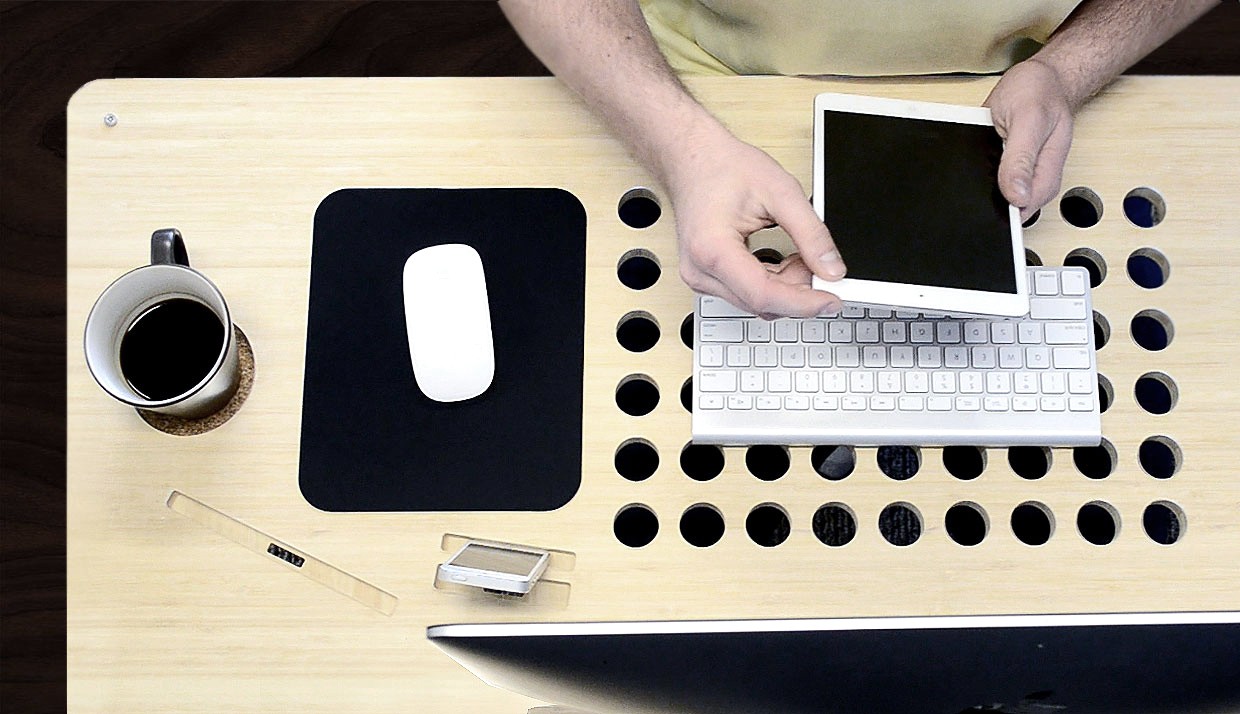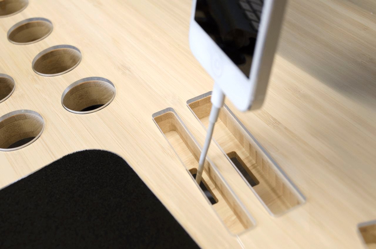 Stół wykonany jest z wysokiej jakości bambusa i wsparty jest na dwóch parach wysokiej jakości stalowych nóg. Powierzchnia zabezpieczona jest powłoką akrylową, a wycięte w stole otwory służą do chłodzenia laptopa oraz niezliczonej ilości kabli i przewodów, które z każdym nowym gadżetem technologicznym stają się coraz bardziej skomplikowane. Nawet wycięcia nie są byle jakie – można w nich umieścić urządzenia mobilne lub filiżankę pachnącej porannej kawy.