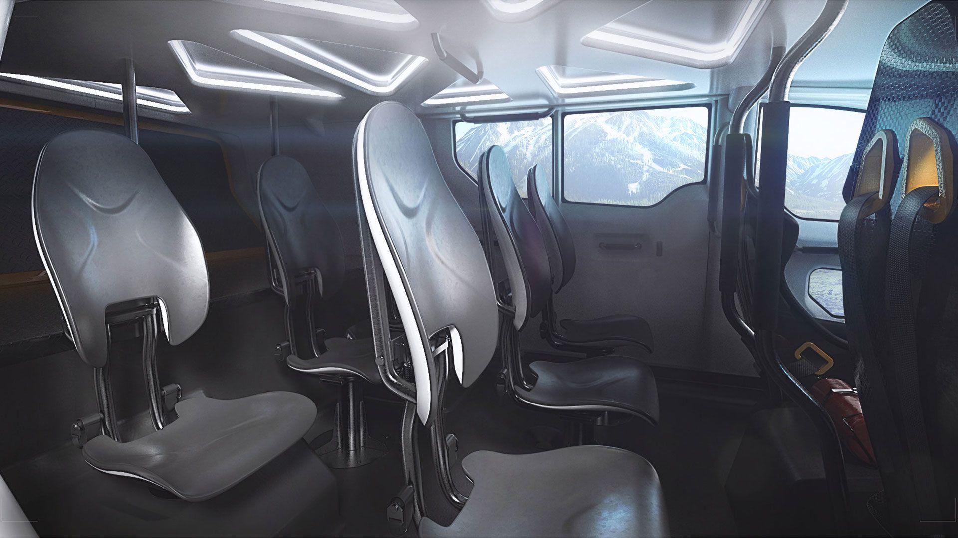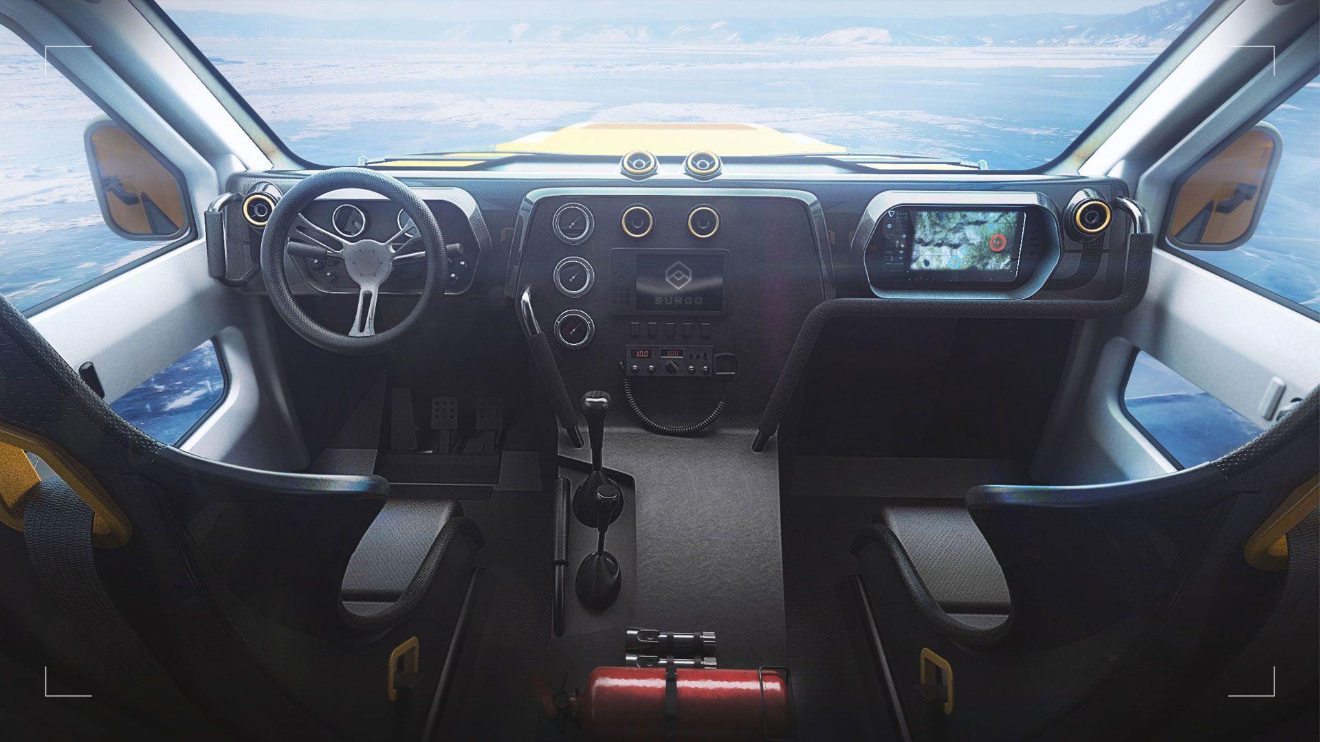 Potniška kabina ima veliko vetrobransko steklo, kar omogoča maksimalen pregled nad okolico in stanjem terena. Pred voznikom ni veliko instrumentov, samo nekaj osnovnih, da se lahko voznik povsem posveti vožnji po zahtevnem terenu. Zaslon za navigacijo do ponesrečenca je pred sovoznikom, ki pomaga vozniku pri navigaciji. Zadnjih šest sedežev je mogoče zložiti, s tem pa ustvarimo dovolj prostora za nosila. Ali bo Surgo resnično zaživel ali ne, bomo še videli, smo pa prepričani, da bi ga z veseljem uporabljali prav vsi gorski reševalci.