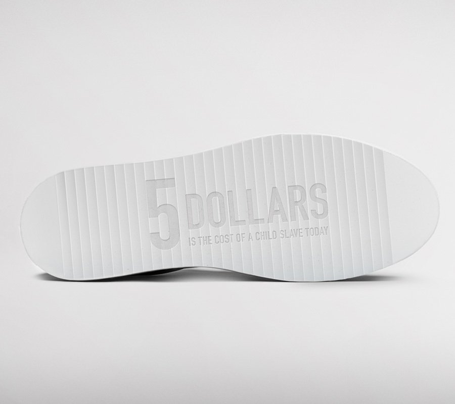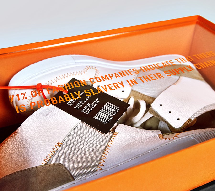 Kampania, która to napędzała Fundacja Thomsona Reutersa, ma na celu podniesienie świadomości na temat ciemnej strony konsumpcjonizmu. Odkrywcze są sneakersy wykonane ze skóry, zamszu i siateczki, które powstały specjalnie na potrzeby tej kampanii makabrycznych faktów na temat współczesnych form niewolnictwa i pracy przymusowej.