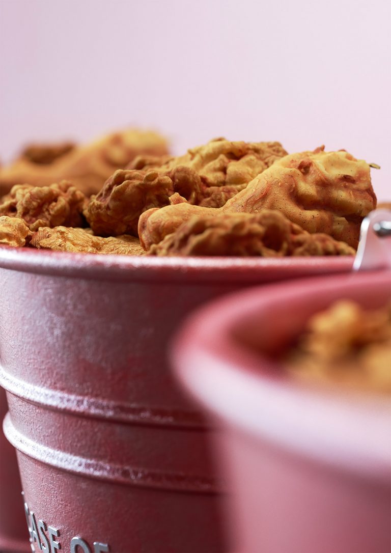 Fearley wzbogacił narzędzia ratownicze o żywność I napój. W ten sposób gaśnica przekształciła się w gigantyczną butelkę wina, a młotek ratowniczy został zastąpiony przez s kawałki pysznej pizzy. Będą na Ciebie czekać w apteczce pączkii w wiadrze z wodą kawałki smażonego kurczaka.