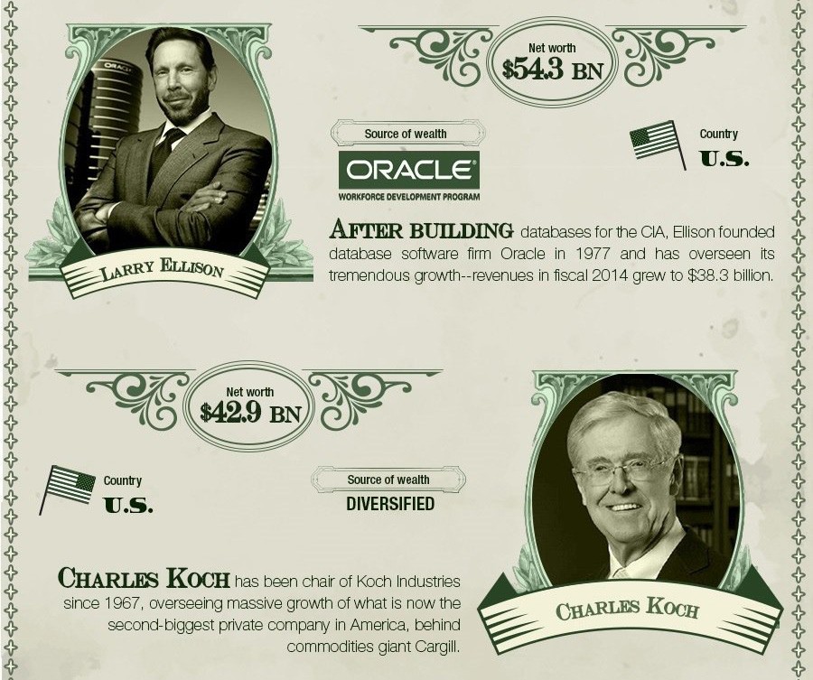 1191 milijarderjev je obogatelo samih, 230 milijarderjev je svoje bogastvo podedovalo in 405 milijarderjev je podedovalo del bogastva, ki pa ga sedaj še veča. Osem od desetih najbogatejših milijarderjev na svetu je Američanov in dve izmed teh sta ženski. Večina milijarderjev, kot so Bill Gates, Warren Buffett in Larry Ellison, so obogateli sami, medtem pa je le manjšina svoja bogastva podedovala.