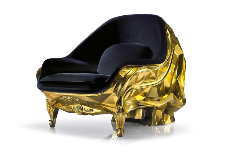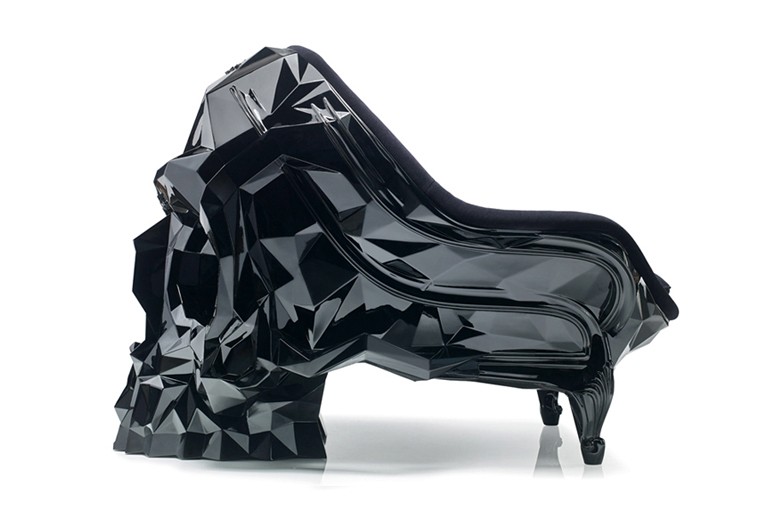 Zlovešči zlati naslonjač v obliki lobanje dopolnjuje črni žamet, ki se lepo poda k zlatemu “ohišju”, zgrajenemu okoli okostja iz jekla in steklenih vlaken.