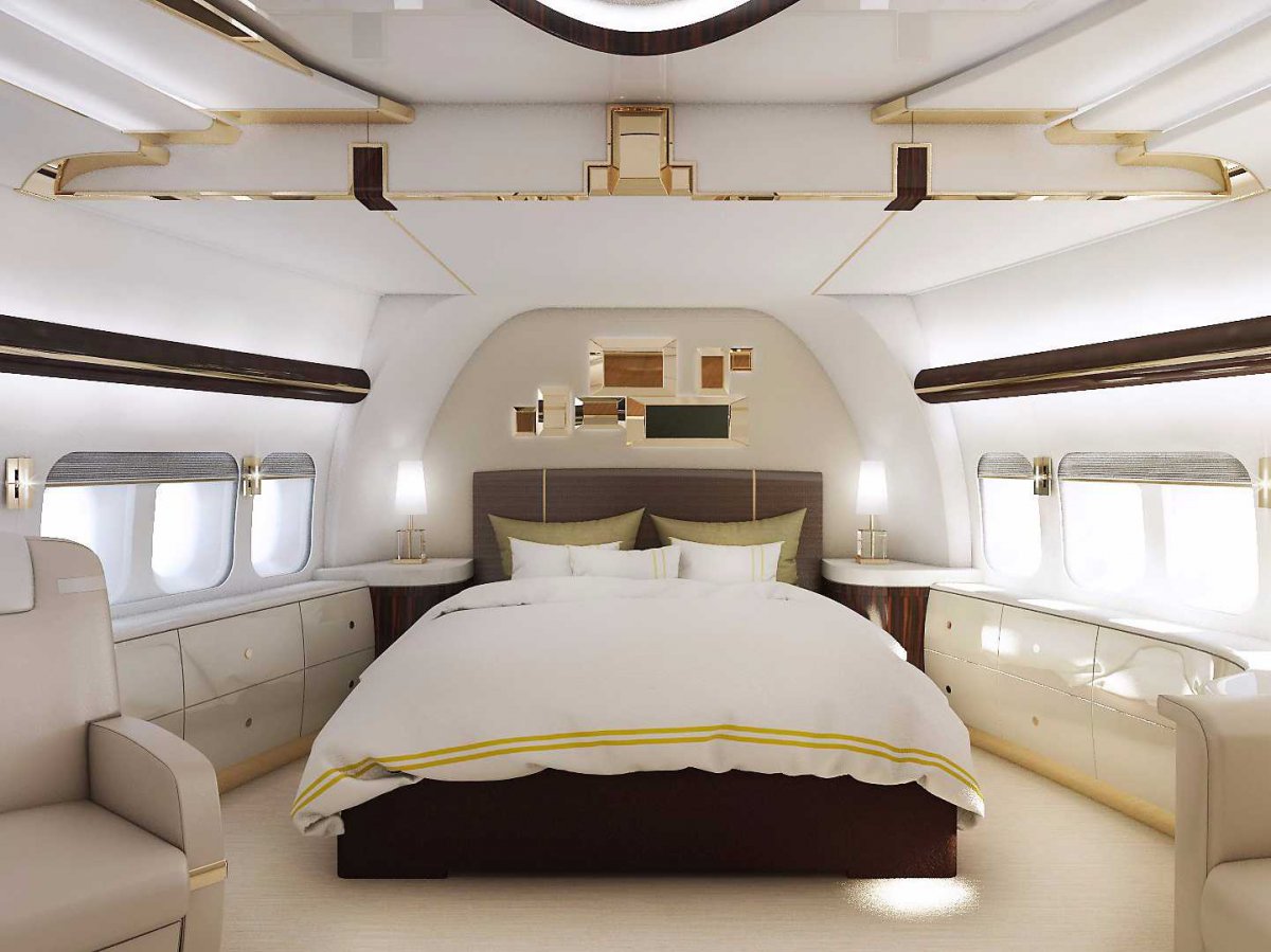 Przeprojektowany, prestiżowy Wersja VIP Boeinga 747-8, pałac wszystkich pałaców w chmurach, jest jak dotąd najbardziej prestiżowym zamówieniem na samolot i ma już anonimowego właściciela. Klejnot nieba, jak się je nazywa w Boeingu, który wypuszcza takie wersje samolotów pod marką Boeing Business Jet (linia tego typu samolotów Airbusa nosi nazwę Airbus Corporate Jet) i została ukończona w Technologie Greenpointa, na 4786 metrach kwadratowych oferuje prestiżowe kabiny, salon, biuro, salę konferencyjną, boską sypialnię i gigantyczną jadalnię.