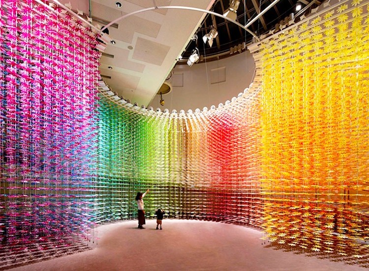 Ponad 25 000 kolorowych papierowych kwiatów zdobi 6-metrowe atrium centrum handlowego w Omotesando w Tokio. Oszałamiająca wizualnie scena jest częścią najnowszej instalacji urodzonej we Francji Emmanuelle Moureaux, która stworzyła to żywe dzieło w ramach wystawy „Uruchamianie przyszłości”.