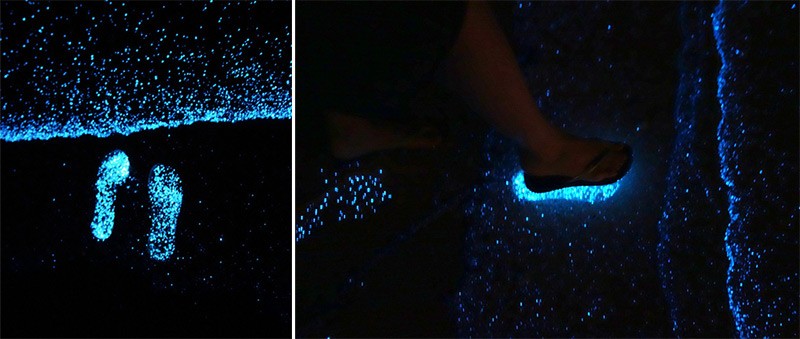 Plažo je prikrilo več milijonov bioluminiscentnega fitoplanktona, ki se v temi modro sveti. Ti mikroskopsko majhni organizmi svetijo na podoben način kot kresnice, zanimivo pa je to, da pod stresom, to je v primeru močnejših valov, svetijo šibkeje. In čeprav gre za fenomen in kemijske mehanizme, ki so poznani že dalj časa, biologi šele sedaj odkrivajo razloge zanj.
